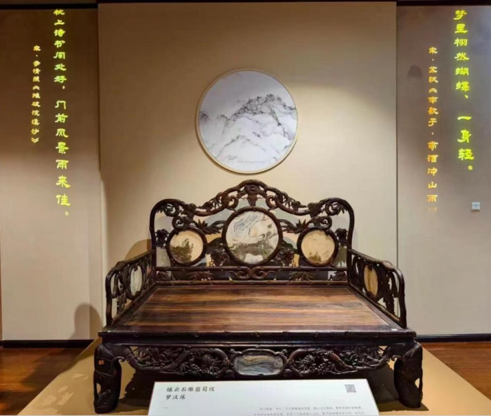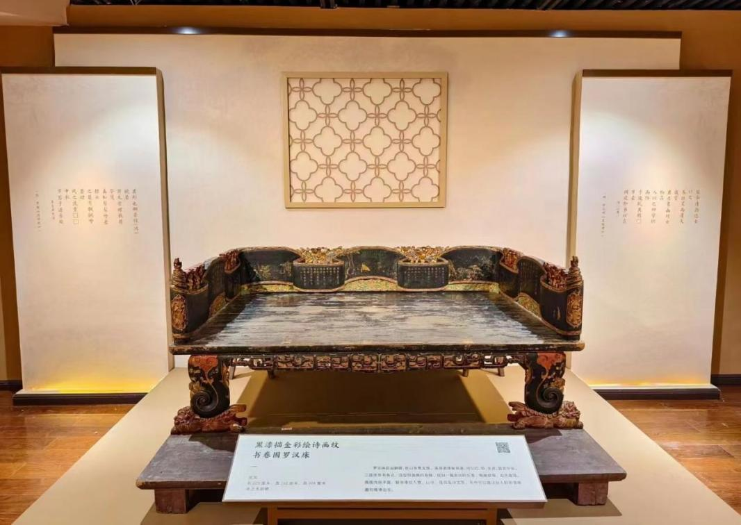罗汉床是展览中的一大亮点,其形制独特,坐卧两用,深受古代文人雅士的喜爱。深圳博物馆藏的罗汉床制作讲究,工艺精湛,有的镶嵌云石,有的刻诗文,有的描金漆绘,还有的雕刻各种繁复图案。其中,民国时期的黑漆描金彩绘诗画纹书卷围罗汉床,床身通体髹黑漆,间以红、绿、金漆,显得富贵华丽。三面床围书卷式,造型似连绵的卷轴,画面内容丰富,描金漆绘人物、山水、花鸟及诗文等,从中可以窥见时人的闲情雅趣和精神追求。
