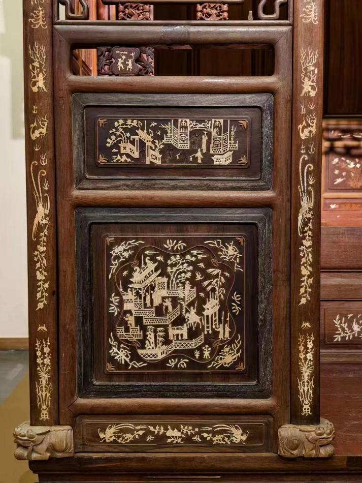 民国·花梨木嵌骨人物故事花鸟纹拔步床(局部) 张之先捐赠