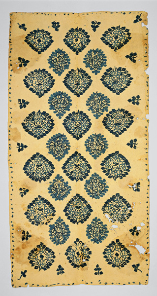 “花毡”是指带有花纹的羊毛毡毯。这种织物源自草原游牧民族,而尤为唐人所喜用。一张结实厚重的毡毯在唐代可谓是冬天御寒“神器”。毡毯挂在墙上就是挡风的暖帘,铺在地上就是保暖的坐垫。大诗人白居易就是毡毯的忠实用户,“短屏风掩卧床头,乌帽青毡白氎裘”,保暖的毡垫是诗人能在冬日的晨间优哉游哉的资本。而正仓院收藏的这一件花毡白地蓝花,菱形的叶片与圆形的花瓣紧密搭配,花毡的周缘另用枝叶点缀,呈现出独特的视觉美感。本次展出是这一件花毡继 1965 年后将近 60 年的第一次展出。