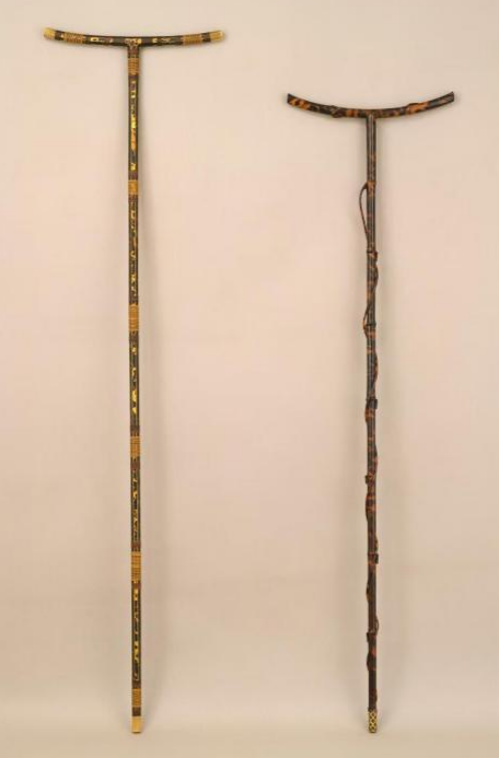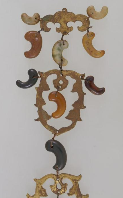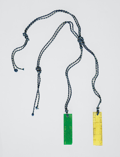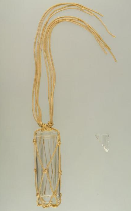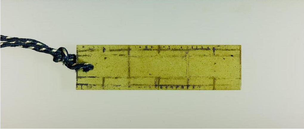 中国古代的贵族总是在腰间悬挂着各种华丽的佩饰,奈良时代的日本贵族也深染此风。这两件琉璃小尺便是用组绳系起来,被认为是穿在腰带上的佩饰。碧琉璃小尺是使用含铜成分的铅玻璃,从而呈现出绿色,其正反两面用金泥标上 2 寸 5 分的刻度。黄琉璃小尺则是使用含铁和铜成分的铅玻璃,从而呈现出黄色,其比碧琉璃小尺稍长,正反两面用银泥标上 3 寸的刻度。这两件半透明的琉璃小尺中,可以折射出奈良时代贵族风尚的光辉。