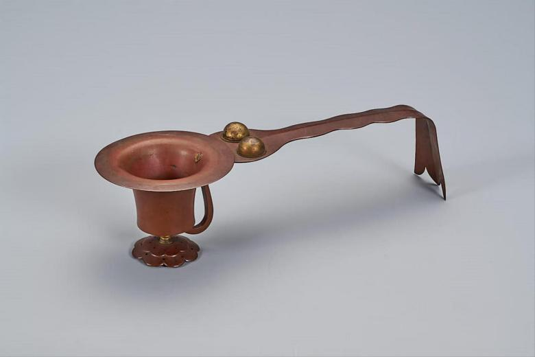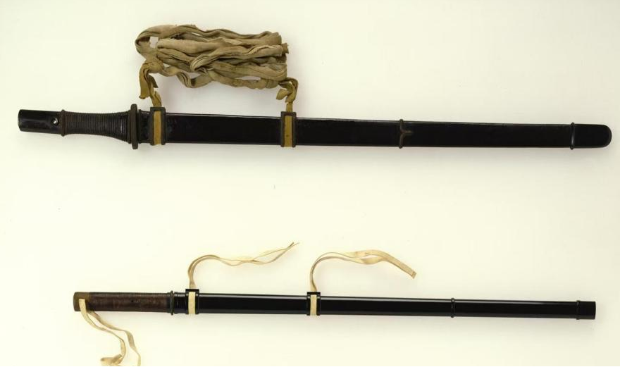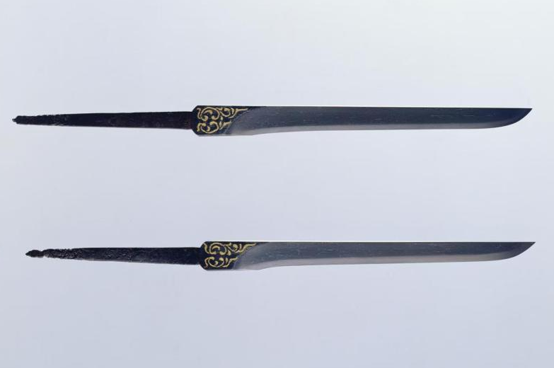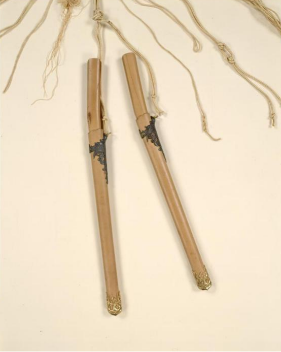除了这些琉璃制品,刀具也常常作为腰间装饰使用。这一套黄杨木把鞘刀子的刀把和刀鞘使用黄杨木制成,银制的带执金具雕刻成鸟衔细环的构思,是奈良时代所喜用的表现手法。