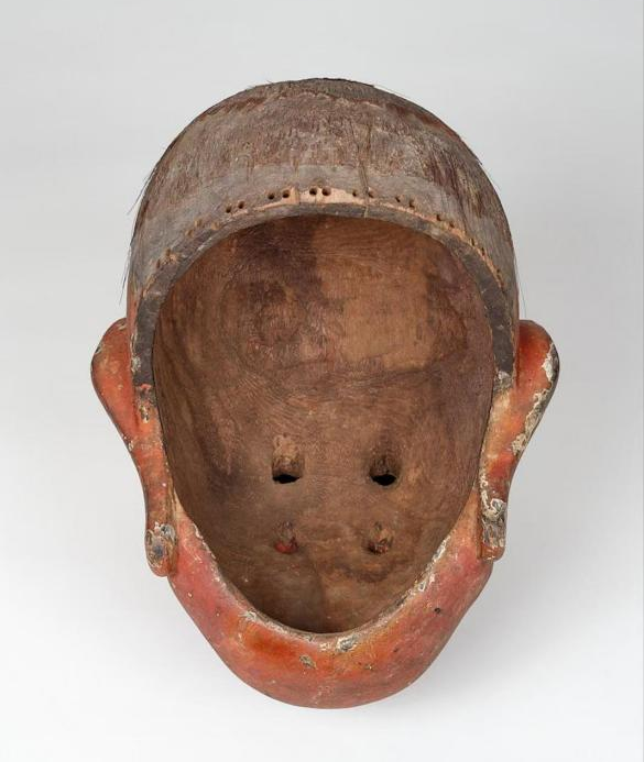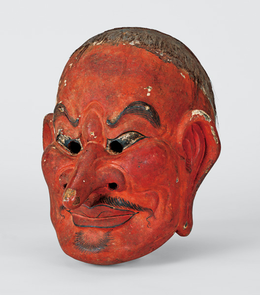 这件醉胡从面具表现的是高鼻深目的胡人,由桐木制成,将表现涂成红色,表现出醉酒的模样。顶部有动物毛发残留,推测是用马的鬃毛来制作头发。面具的背面有墨书,可以知道是一个叫舍目师的人的作品。在这部伎乐中,由 8 人组成的醉胡从将跟随醉胡王在乐舞的最后阶段登场,举办一场盛大的酒宴。研究者推测,表演者可能是通过表现出烂醉如泥的姿态来营造喜剧氛围。