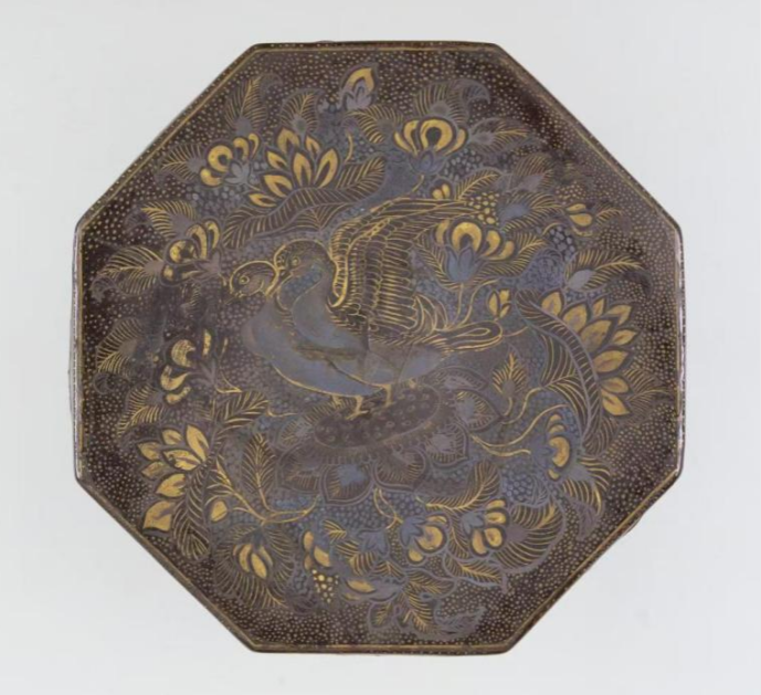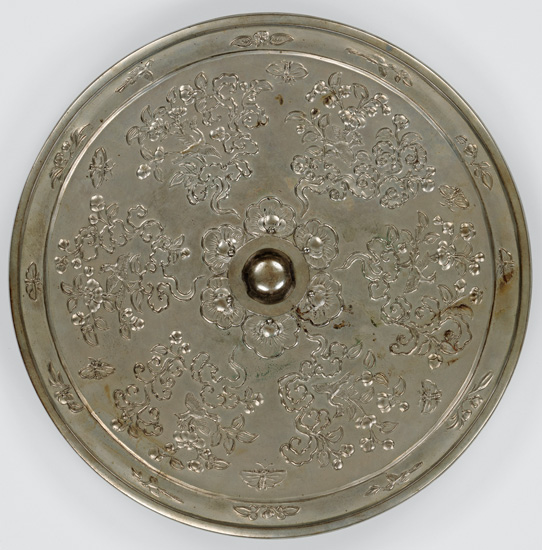 这件花鸟背圆镜也见载于《国家珍宝帐》,为光明皇后所贡献的与圣武天皇有关的 20 面镜子之一。圆镜由白铜铸成。所谓白铜,就是含锡较多的青铜。镜背采用细腻的浮雕技巧,以圆钮为中心,花瓣与祥云呈放射状散开,云端又开出枝叶,花蕊与飞鸟点缀期间,空白处勾勒出翩翩蝶舞,画面丰富而又精细,展现出制作者高超的技术水平与独特的巧思。经过现代学者对其金属成分的分析,发现其金属组成与唐代的铜镜相近,因而可以认为是来自唐朝的舶来品。