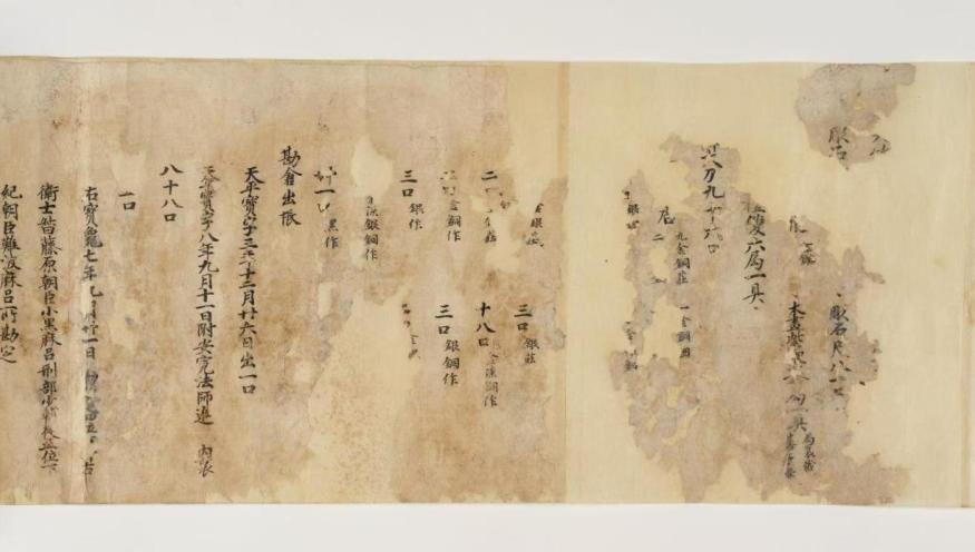 这件古文书是延历 6 年(787)检查正仓院北仓宝物时的记录。这一次也是光明皇后将宝物捐献给东大寺后进行的第一次检查。正仓院在干爽的秋季,开仓曝晒和清点藏品,这一传统正是如今一年一度正仓院展的渊源。