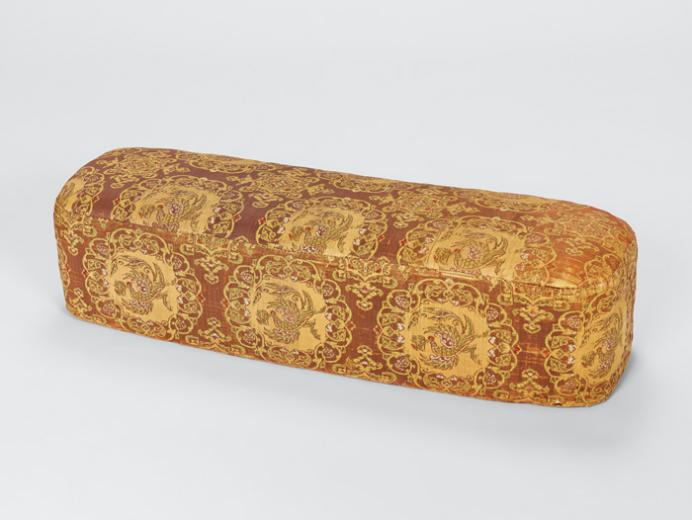 这件紫地凤形锦御轼正是圣武天皇的生前爱物。《国家珍宝帐》载“御轼二枚,一枚紫地凤形锦,一枚长斑锦”,所说的正是这件宝物。所谓“御轼”,即扶手,为室内坐卧时供人倚凭的靠垫。御轼的内部是由植物原材料捆束起来,塞上棉花,用麻布包裹之后,再在表面覆以奢华的锦缎织物。作为天皇的日常使用物件,御轼的织锦格调高雅,色彩华丽,被葡萄藤、唐草纹围住的凤凰昂首挺胸,展开双翼,姿态强劲有力,威风凛凛。今年的正仓院展将会把这件御轼的真品同去年完成的复制品一起展出,希望用这样的方式来增进观众对于文物的了解。这也是今年正仓院展具有创新性的一面。