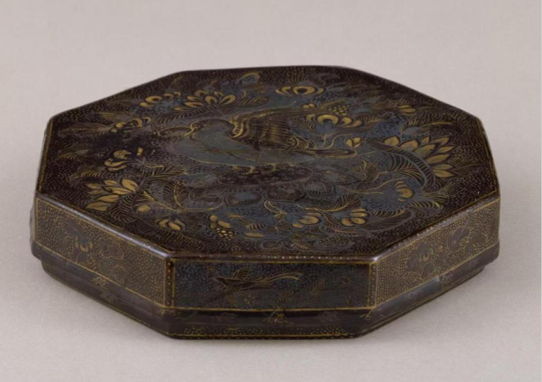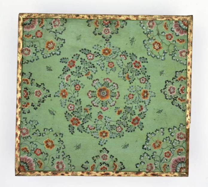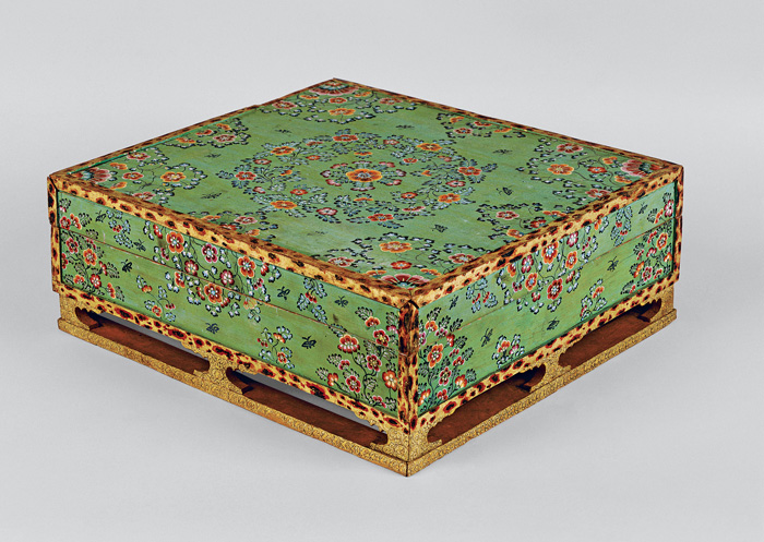 这件绿地彩绘箱应当也是性质相近的献物箱。箱身用绿色做底色,其上用红、橙、黄等相当明亮的色彩来描绘花纹。箱子边缘贴上金箔,用红色和墨色画出斑点,装饰出近似玳瑁的光泽效果。箱子下部的床脚同样贴上金箔,其上再用墨笔勾勒出唐草纹,看起来像是透雕的金属配件。和沉香木画箱一样,这两件箱子都是进口名贵的原材料,用繁复的工序来加工,营造出精致绝伦的视觉效果。