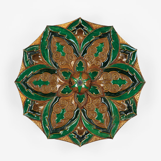 提到镜子,就不得不关注这件黄金琉璃钿背十二棱镜。正仓院展每年都会选出一件藏品作为中心藏品,用作展览海报、参观券以及图录封面的图案。今年的中心展品正是这面形制瑰丽的古镜。该镜是正仓院藏品中唯一的银制镜胎,也是唯一的“七宝”制品。所谓“七宝”,指的就是金属珐琅器,可见其价值非同凡响。镜背用黄金雕造出大大小小十八枚花瓣,表现出三朵同心宝相花。花瓣之上再施以黄绿色琉璃质釉彩,釉面光亮,色彩浓重,花纹的边线则用金丝勾勒。镜背只用黄、绿、深绿三种颜色就表现出极富层次感的设计,令人惊叹。由于镜背的宝相花形与唐代流行样式相似,因此有学者怀疑该镜为唐代制作。倘若这一推测属实,那么这件文物就是唐代已存在金属胎珐琅器的重要证据。