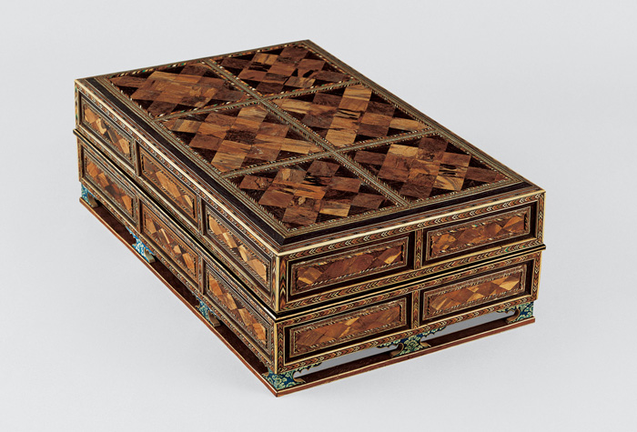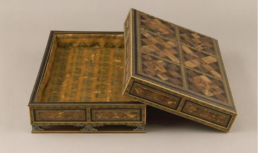 这件沉香木画箱以白檀为底,表面通过拼贴多种木材来构造花纹,这种技法称为“木画”。这件箱子以紫檀为框,将沉香木剪切成菱形或三角形进行拼贴,通过不同的色调装饰出几何纹样,再用象牙、黑檀薄片来区分边界。箱子的下部是紫檀制成的床脚,在染成绀色的象牙表面用拨镂技法雕刻出花草纹样,贴在紫檀制成的床脚上,作为箱子的支撑。箱子里面则用黄赤地小花文锦做内衬。装饰如此华丽的收纳具,很可能是用来放置供奉给佛祖的物品。