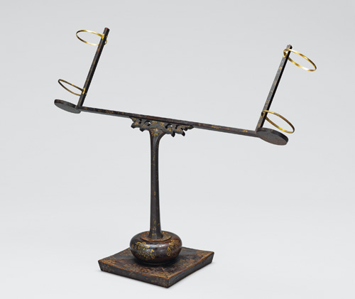 杨炯称他的书架“其始也一木所为,其用也万卷可披”,仅凭这一描述仍然很难想象书架的形制。好在,这件紫檀金银绘书几为我们提供了绝佳的实例:一根立柱竖立在带有球形柱座的方形基座上,上方横木展开,横木两端各有一个圆托,形成支架。圆托的内侧再支起细木,细木上安装有两个可以启闭的铜环。当需要展卷读书的时候,就可以打开铜环,将卷轴放入,如此便解脱了双手一直握持之苦。正仓院收藏的这件书几由紫檀木制成,表面用金银泥绘制花草与飞鸟,十分奢华。