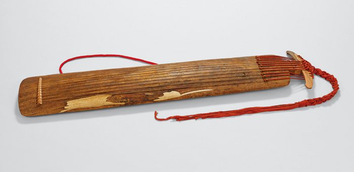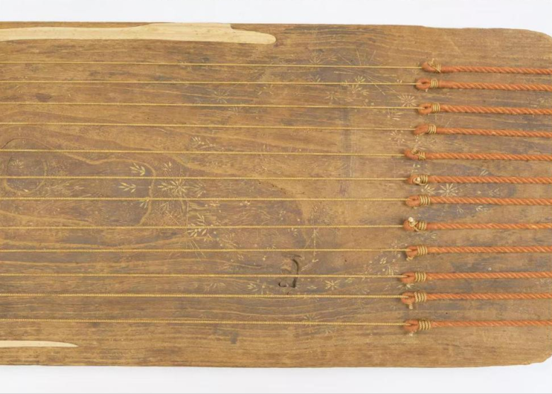 乐器是每次正仓院展都不容错过的重要角色,这张新罗琴更是本世纪首次展出,十分难得。从名字就可以看出,它是一件来源于朝鲜半岛的舶来品。新罗琴,又称伽倻琴,是朝鲜半岛古老的弦乐器。相传 6 世纪由朝鲜半岛南部的伽倻国嘉实王仿照中国的筝创制而成。其后传入日本,在日本被称为新罗琴。因此这件乐器虽名为琴,却与筝更加亲近。