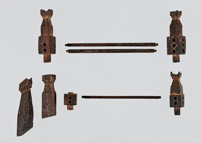 除了这些精美复杂的木制品外,正仓院还保存了 500 多片木质建筑构件,以紫檀木为主,其中大部分可以确定所属部位,包括栏杆、屋檐等位置。形制相同的构件也有大小不同的尺寸,因此推测其本来用作每层规格不同的多层建筑。一部分构件上还贴有金箔,或者留下了曾装饰有金具的痕迹。根据学者最近的研究,发现这些构件实际上是在芯材表面粘贴紫檀薄板,或者是由多个小型紫檀木材聚合拼接形成的构件。看来极为珍贵的紫檀木,古代的大贵族们也都得省着点儿用。
