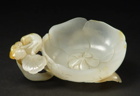 这件玉杯应该是玉洗,犹如一朵盛开的花朵,五瓣相连,杯内凸雕五瓣小花为蕊,一镂雕藤状枝叶构成杯柄和杯托,脉络清晰。