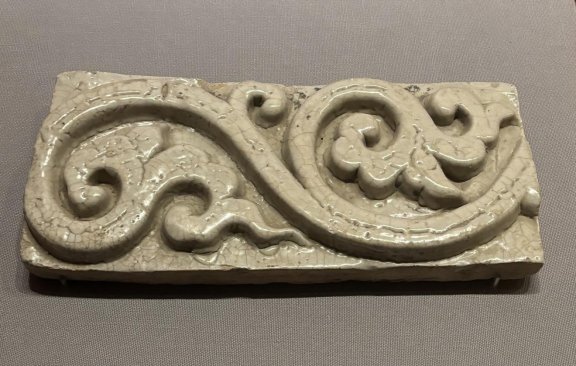 除了气势恢弘雕工精美的石构件,明中都遗址还发掘出不少规格极高的瓷构件。比如这片看起来平平无奇的瓦当,就采用了难度极高的釉里红烧造技法。
