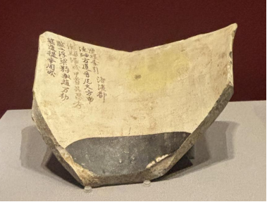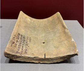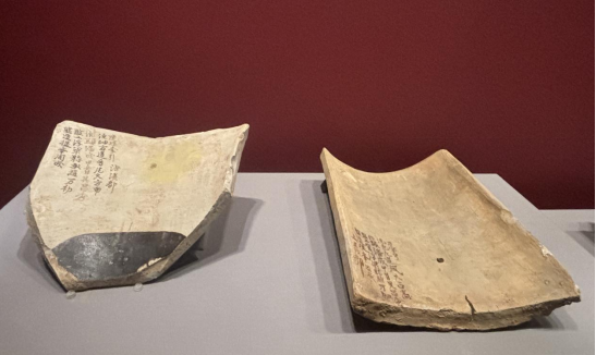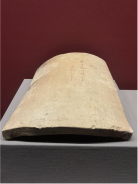 这块瓦片详细记载了制瓦工匠和监制官员的相关信息:作头潘成,甲首吴昌秀,监工官浮梁县赵万初,监造提举周成,上义都。这是研究当时陶瓷生产分工的珍贵资料。印证了清康熙二十一年( 1682 年)《浮染县志》记载的相关史料。两件同由赵万初监工,流往不同工地的板瓦,隔着 600 多年的时光,在同一展柜重聚,令人不禁感叹历史的奇妙。或许,这正是博物馆展览的独特魅力所在。