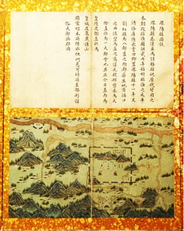 这件明万历时期凤阳县的县城图,非常详细的描绘了当时的山形地貌。卞坚介绍,这是现存明代真正意义上凤阳最早的地图,本次展览序厅的背景就出自这幅图。从这张图上可以看到,在皇城的正后方有座万岁山,这是凤阳当地的自然山脉。而今天北京故宫神武门后面的景山,则是人为堆砌而成,便是遵从了凤阳当年的这种山形地势。