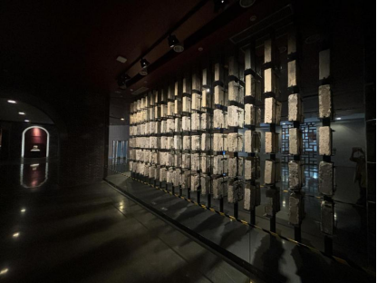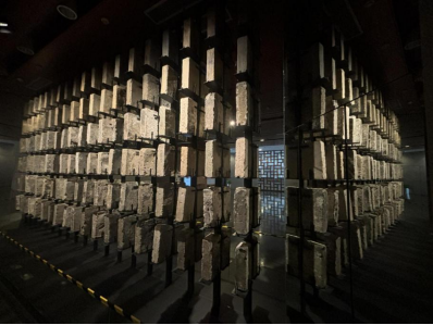 另一处重要的打卡点,在 5 楼第一展厅和第二展厅之间的连接处,这个打卡点被命名为“砖阵”。卞坚介绍,这个“砖阵”是用凤阳博物馆馆藏,明中都遗址采集的明代城墙砖设计的,“虽然观众不能上手去摸,但是确实可以感受中都城的恢弘气势。”