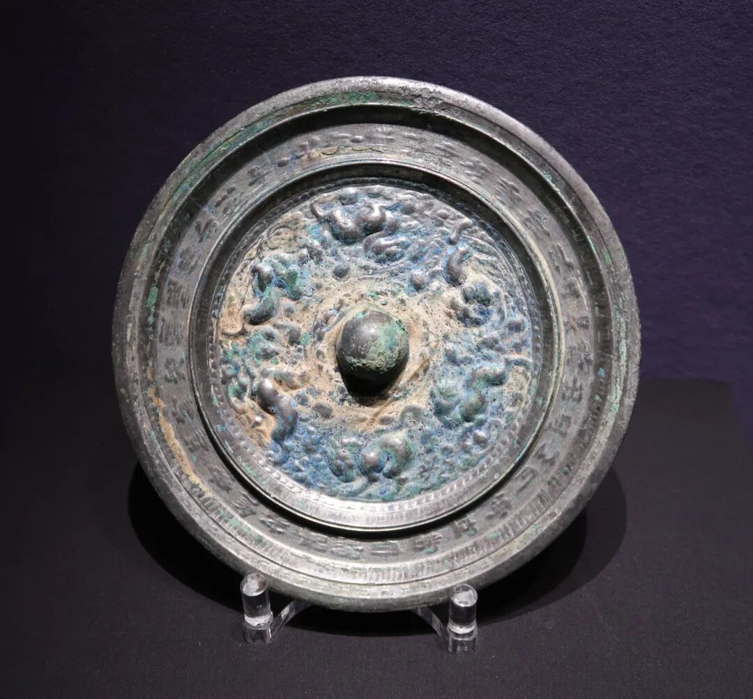 铜镜主体纹样为六瑞兽绕钮呈奔跑状,外圈铭文为 32 字楷书四言骈体文。此类铭文在隋唐的团花镜中常见。辽会同五年( 942 )耶律羽之墓中,也发现有相同纹样及铭文的铜镜。