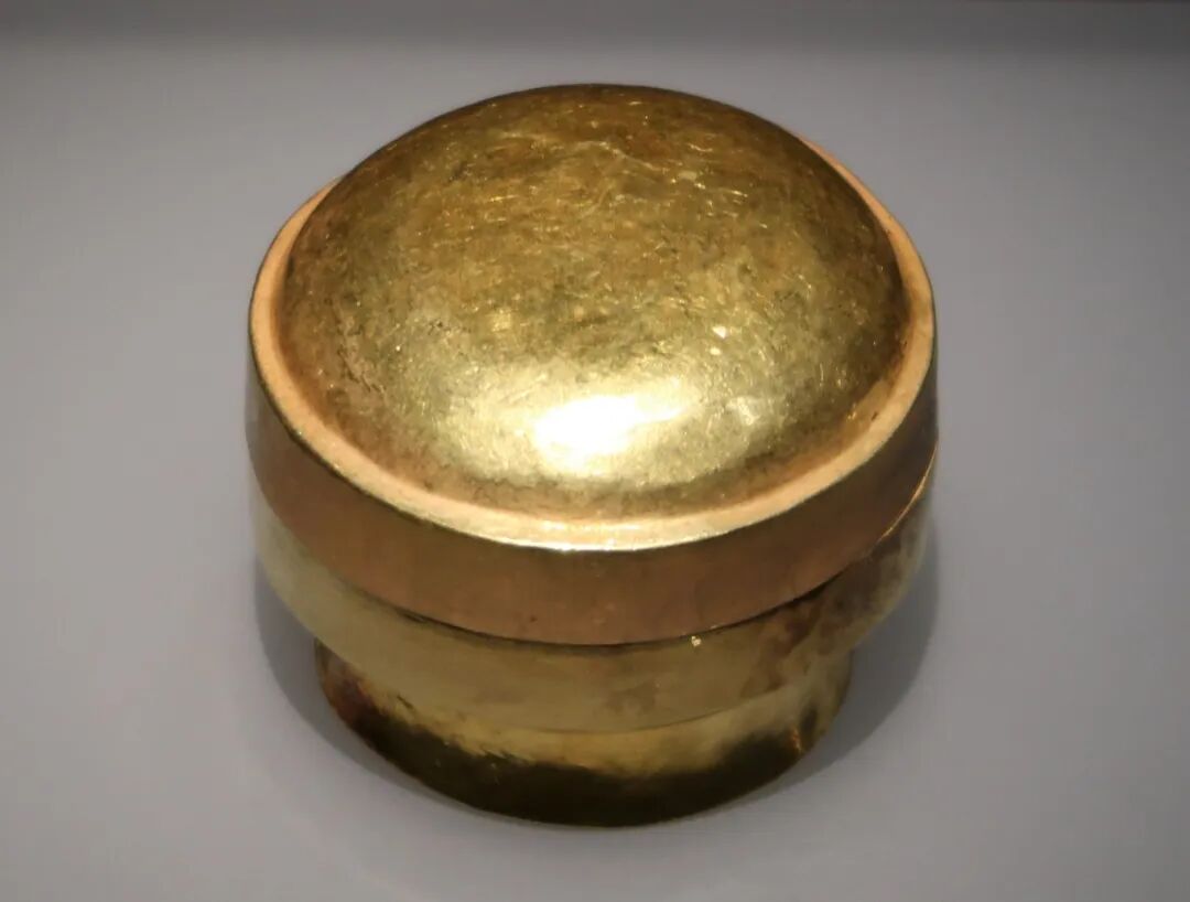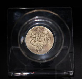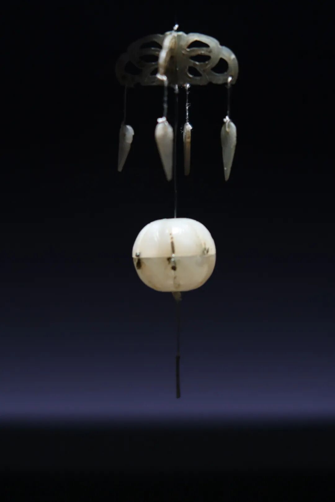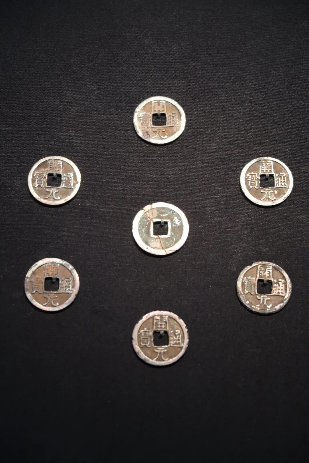 水丘氏墓出土,一组 7 枚。一枚背面有上月纹,其余皆为素面。“开元通宝”是唐代铸造的一种货币,有金、银、铜、铁、铅多种材质。官铸用于流通的主要是铜质,而金质、银质开元通宝不作为流通货币使用,多用于吉庆、赏赐、游戏、新婚夫妇撒帐、婴儿过满月等,因此存世量极小。这 7 枚开元通宝钱币为银质鎏金,应为中原皇室赏赐,是古钱币中罕见的珍品。