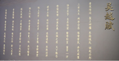 唐宋隙间,裂土碎疆。东南钱氏,崛起兴邦。三世五王,两浙合昌。保境安民,井邑咸康。恪守臣节,志在栋梁。勤修职贡,富甲一方。修城筑塘,劝课农桑。丝绸之府,天下粮仓。建寺立塔,刻经造像。造船通航,丝路远洋。陌上花开,衣锦还乡。三千贤德,香醉满堂。纳土归宋,和平冀望。华夏一统,共写翰章。钱氏家训,千载流芳。前贤勋业,万代怀想。齐器精缘,满目琳琅。瑰宝以待,斯人共赏。衣锦故地,肇地重光。吴越文化,惠泽绵长。