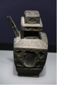 水丘氏墓出土银器中最为完整的一件。盖与罐之间铆焊铰链、搭襻相连。整器平面略方,四角弧转。罐身四条自上而下的凸棱,花纹部分鎏金,是典型的“金花银器”。器盖錾刻双凤衔枝纹,器身四面中间开光分别錾刻龙、狮、伎乐等纹饰,造型端庄优美,工艺精致细腻,纹饰繁而不乱,充分体现了晚唐高超的金银器制作水平。