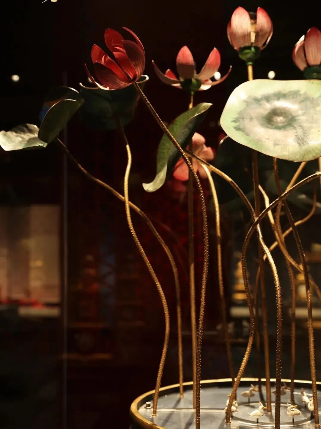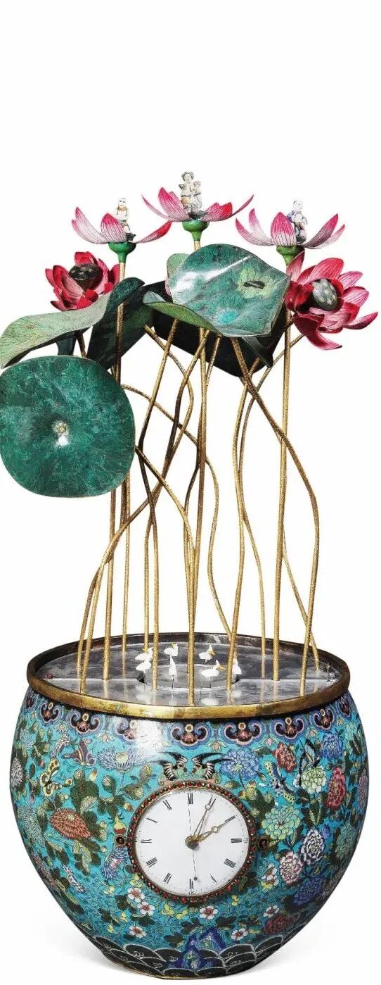 此钟是由清宫造办处工匠用广州制作的掐丝珐琅缸和法国的奏乐机械系统装配而成。钟体为荷花缸造型,缸腹部满饰花蝶纹,腹部正面装表盘,缸中布置荷塘景观,其中三朵荷花可开合,花心中分别端坐西王母、持桃童子、持桃仙猿。上弦启动后,音乐响起,荷花花瓣张开,露出花心中西王母、童子、仙猿,西王母稳坐不动,童子、白猿跪拜呈献桃状。
