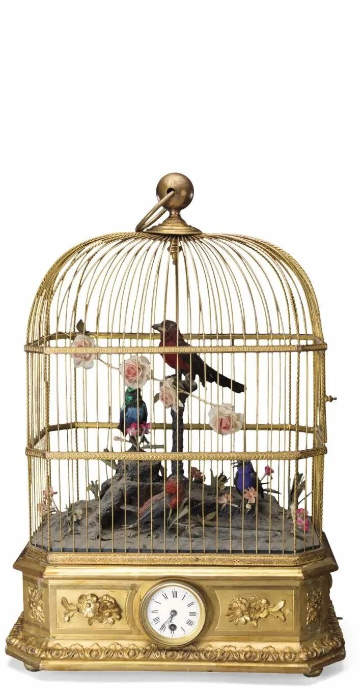 此钟为瑞士制作,以鸟笼为造型,也是为了迎合清代宫廷的养鸟习惯。鸟笼底座内放置音乐及鸟鸣机械装置,白珐琅表盘设在底座的正面。鸟笼内的景观有山石、树桩和水池,山石和树桩上各立有一只鸟,池畔栖息有两只鸟。上弦开动后,音乐响起,四只鸟在转头的同时张嘴鸣叫,抖动翅膀和尾部。