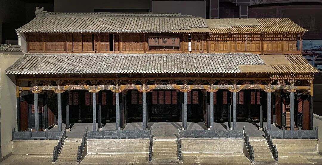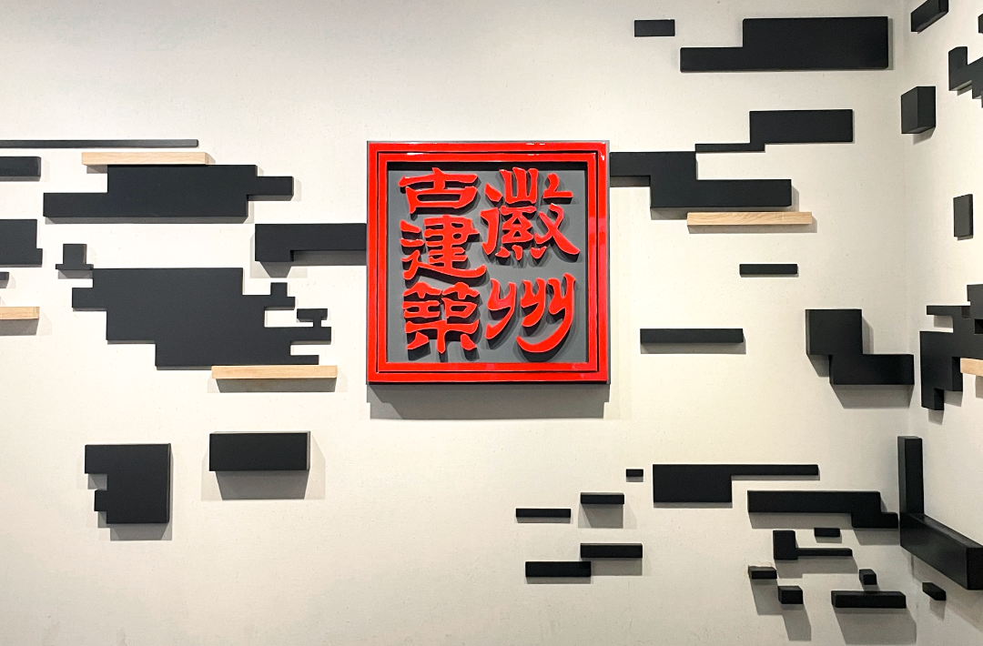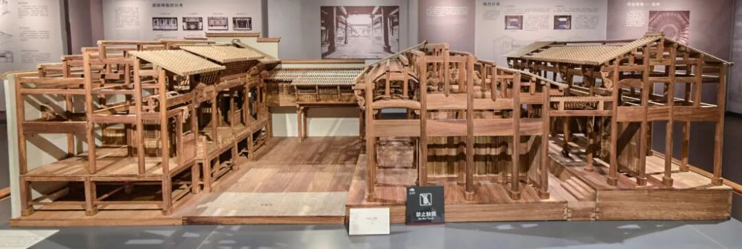 在展厅两侧放置了两件十分引人注目的建筑模型。分别是歙县呈坎村的罗东舒祠与祁门珠林村的馀庆堂(古戏台),模型不仅还原了建筑的外貌,还进行了适当的解剖,将内部结构呈现出来,让观众的视线得以在方寸间跨过仪门,穿越走廊,见享堂而后寝殿,辅以墙上的建筑绘图,仿佛人人都是梁思成,都能够在科学严谨的建筑世界中徜徉。