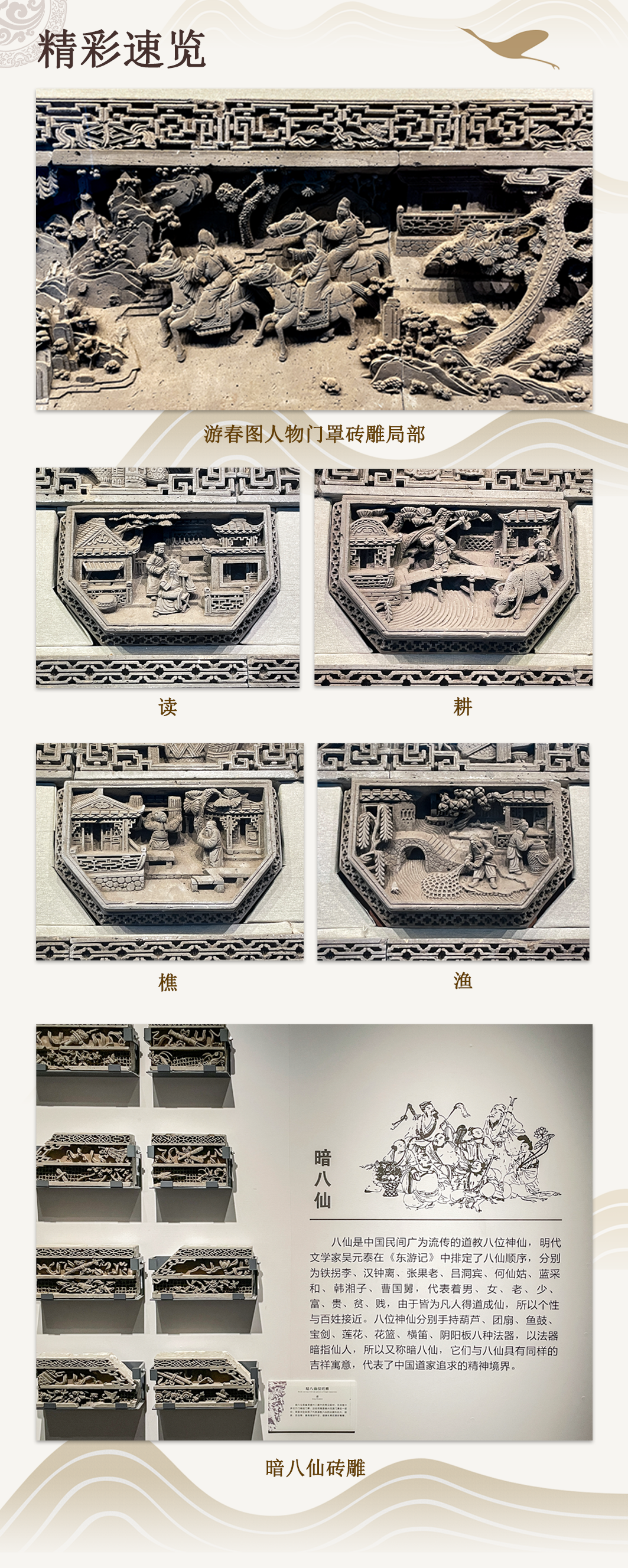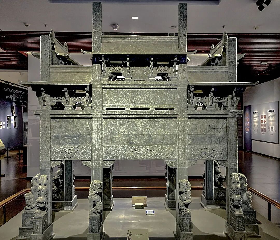 本单元为观众介绍了牌坊的历史演变、形制规格、等级标准、功能与构造,并展出了“徽州牌坊之首”许国石坊模型。该坊是明万历十二年( 1584 年)为表彰明朝大学士许国建造的一座功坊,实物位于歙县城内阳和门东侧,石坊四面八柱,中心呈“口”字形,跨街而立,是中国现存唯一的一座八脚牌楼,有着“东方凯旋门”之称。石坊为仿木结构,方柱断面下宽上窄,重心逐渐向内倾靠,因此,体量虽大但结构稳固扎实。