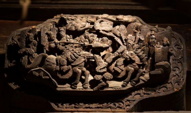 因徽州人崇儒重理,所以三雕艺术身上儒家文化的烙印可谓是与生俱来的。其雕刻内容不乏二十四孝、九世忠臣、及百忍等,展示并宣扬了仁、义、礼、智、信等道德观念,凸显了徽州人以儒家伦理教化后人的理念。这件清代的《穆桂英挂帅戏剧故事石雕》便是忠孝节义主题的体现。它采用圆雕及透雕的技术,再现了战马的嘶鸣,杨门女将的英勇,属石雕中的精品。