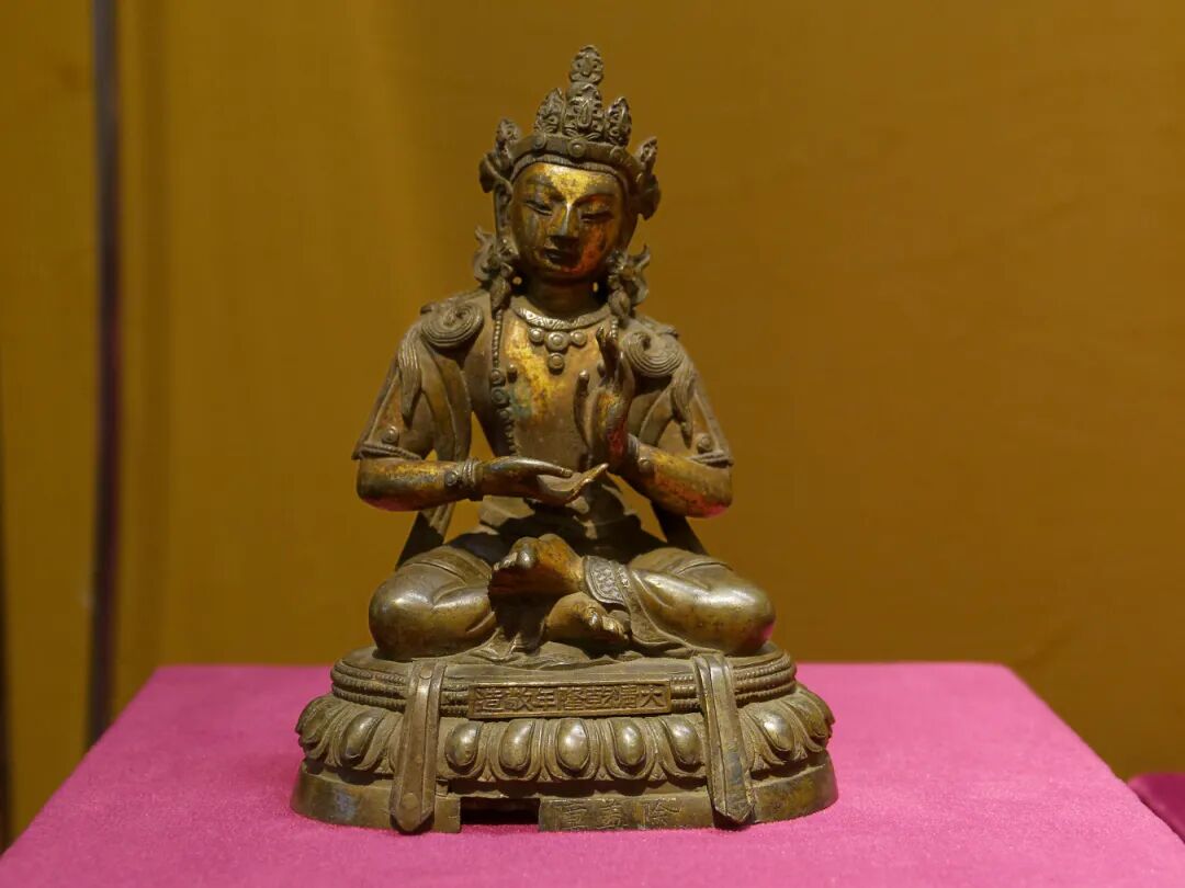 此像属子清乾隆时期建造的六品佛楼中的佛像,从乾隆二十二年至四十七年间( 1758-1783 ),清宫先后修建和装修的六品佛楼达八处之多,莲台上沿有“大清乾隆年敬造” 款,下沿有此尊名号,背后“德行根本”四字,指明此尊曾供奉于清宫某六品佛楼中第五间。