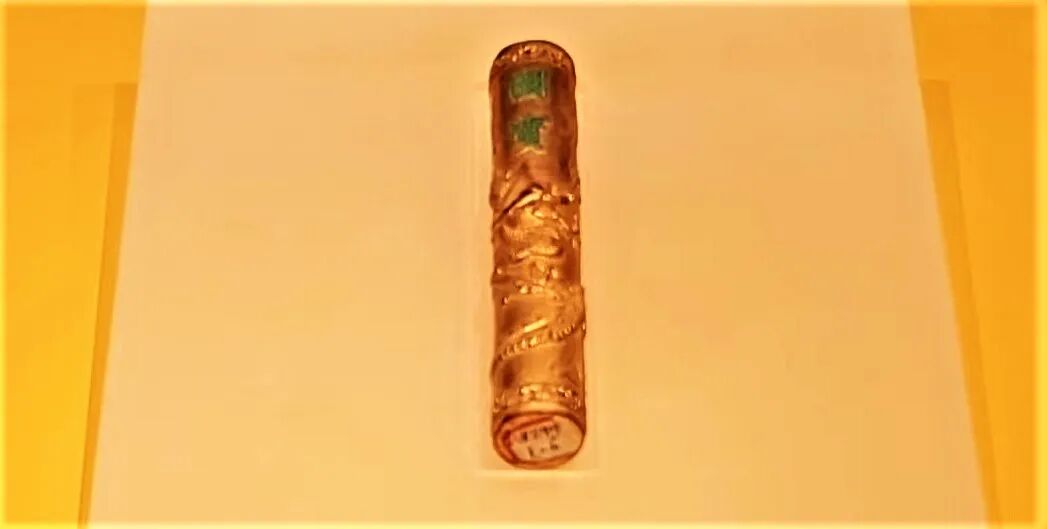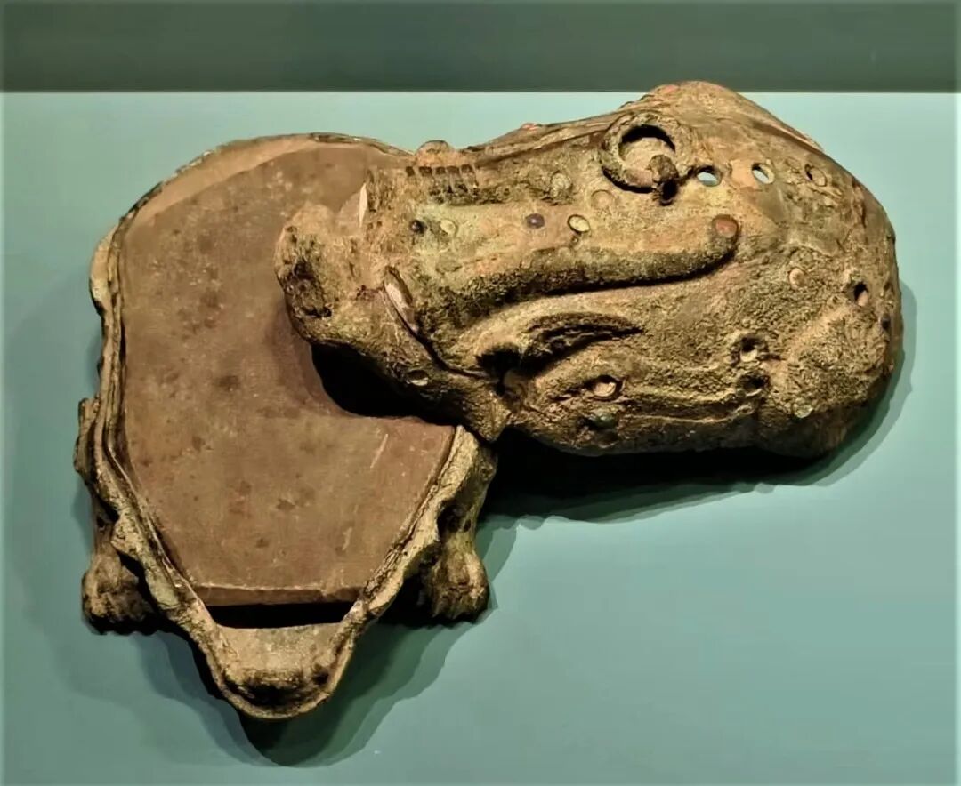鎏金兽形铜盒砚,1957 年肥东县草庙乡大孤堆汉墓出士。盒作兽形,通体鎏金,分盖和座两部分。下座内嵌一石片作砚面。盖顶有铜环,兽头部有双角、短尾,吻部前伸,四足伏地。全身嵌红、黄、蓝、白各色琉璃珠,形象生动,制作精巧。