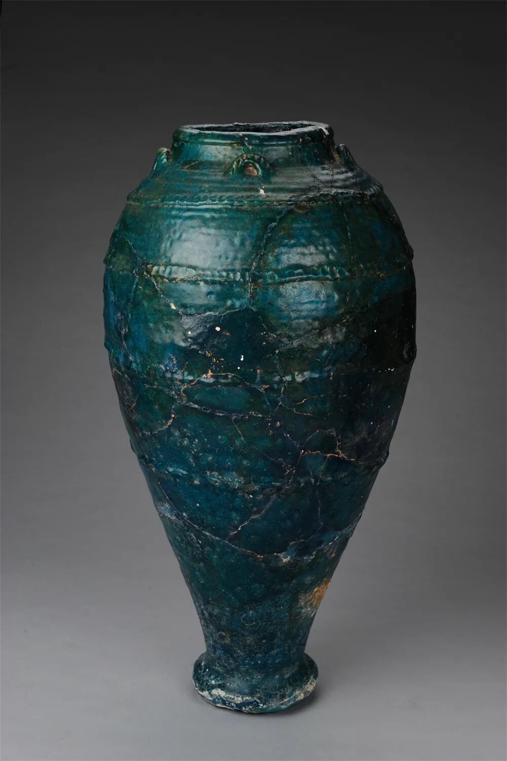 这三个瓶子的体型都比较硕大,通体施孔雀蓝釉,厚而晶莹,总体上瓶敛口,矮颈,广腹,小底。口沿处附小耳,通高 74.5-78 厘米,状如橄榄。该类陶瓶器形产自古代西亚及中亚地区,古波斯地区较为干旱,此类器物在发展过程中多适应其长途取水或迁移的需要。一般用于盛装油、香水、饮品等液体类物质。