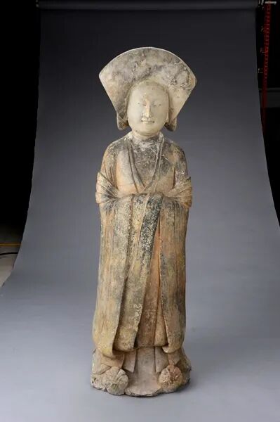 这些陶俑中有戴“王冠”、戴幞头状帽、戴风帽的拱立俑,应为宫中的文吏。幞头弯身俑可能是供奔走的仆人。