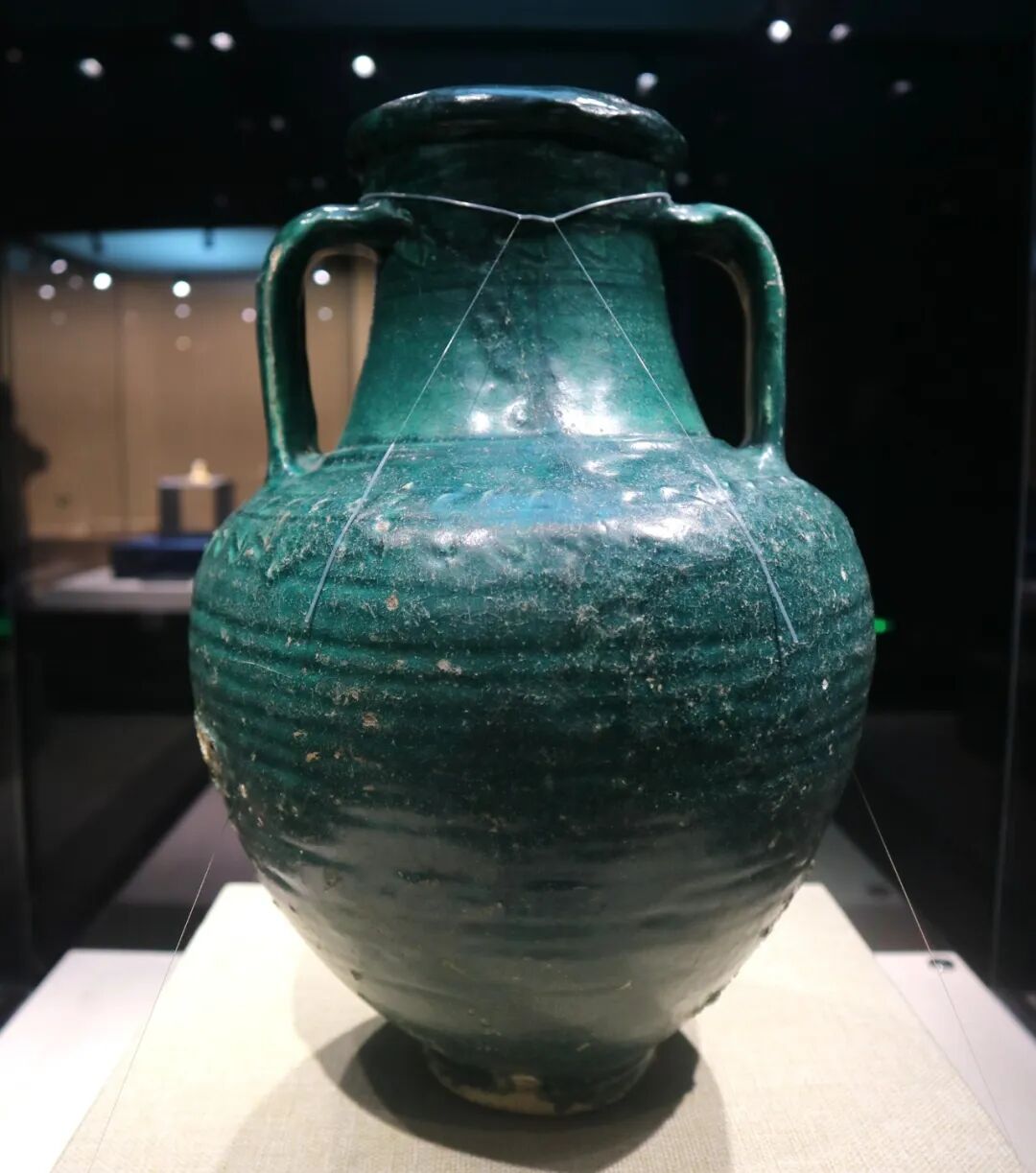 晚唐著名诗人薛能《送福建李大夫》一诗云,福州有“船到城添外国人”,也反映了福州与海外通商的盛况。福建博物院展示的这件孔雀蓝釉陶瓶,形体较大,且陶瓷较易碎,经不起多次辗转,极可能是在五代十国时期,从伊朗通过船载,沿着海路,从福州港进入闽国的。