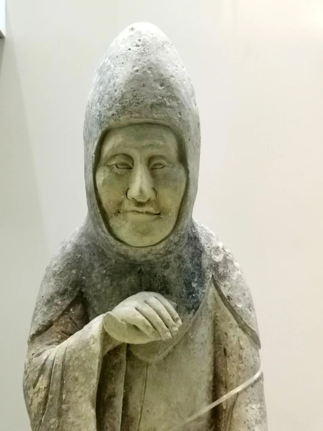 戴风帽扶杖老人俑(局部)