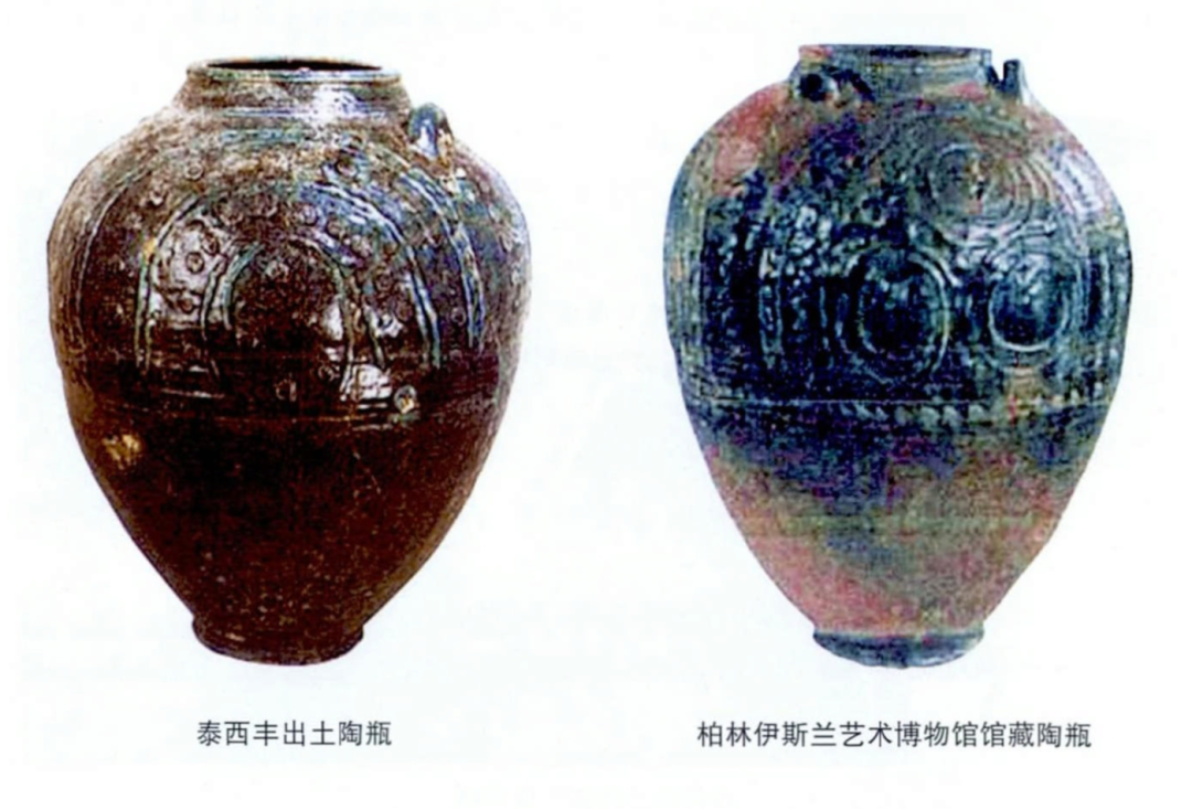 从孔雀蓝釉陶瓶的器形、胎质和器表纹饰看,类似器物在伊朗、伊拉克等多地都有发现,且其与公元 9 世纪到 10 世纪伊斯兰式釉陶相一致(见下图)。因此,这三件陶瓶的产地应该是来自素以制陶著称的古代波斯地区。