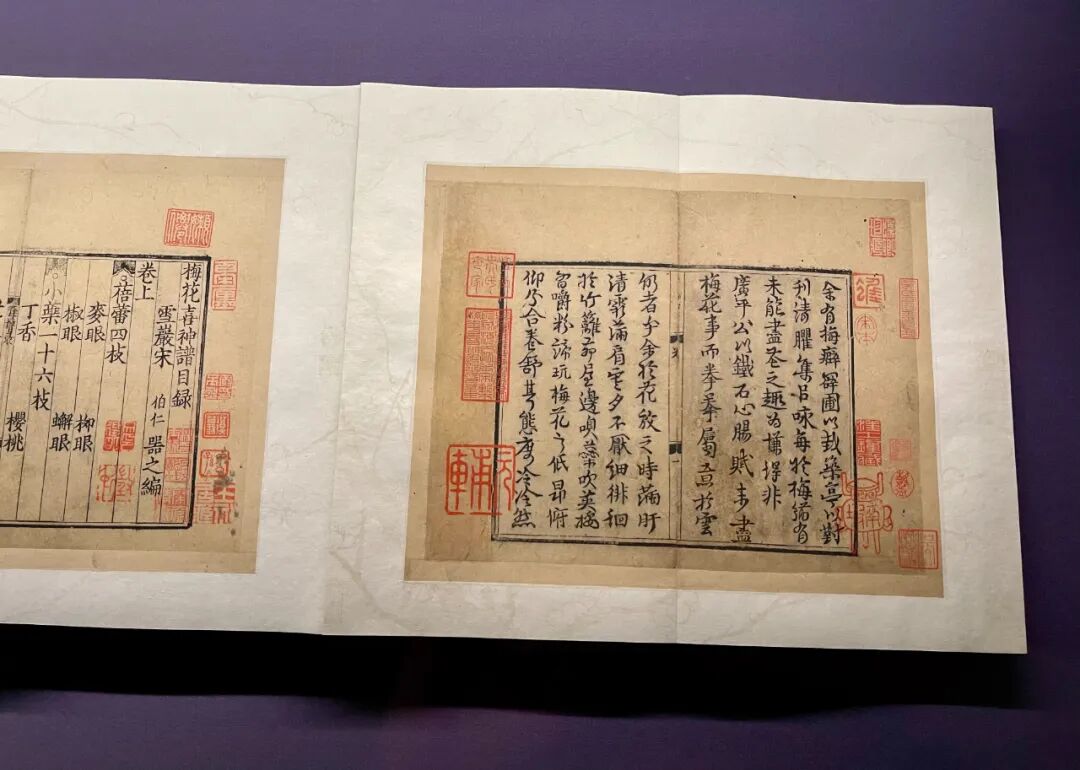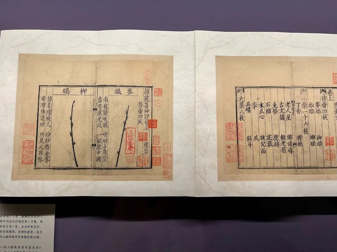 雕版印刷在宋代进入高度发达阶段,刻书机构包括官府、私人、书坊以及寺院。另一处展柜中的《梅花喜神谱》,便是由民间刻书坊“双桂堂”所刻。此谱是中国最早的木刻版画图谱,初刻于宋嘉熙二年(1238 年),原刻本并没有流传下来,之后金华双桂堂于景定辛酉(1261 年)重新刻制,这也是此次展出的版本,为南宋孤本。