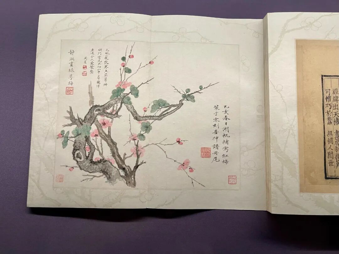 《梅花喜神谱》由南宋末年宋伯年所著,他在自序中称自己有“梅癖”,每到梅花盛开时节,便整天徘徊在园中梅圃,“嗅蕊吹英,挼香嚼粉”,肆意赏玩。他观察到梅花的花期有“蓓蕾”“小蕊”“大蕊”“欲开”“大开”“烂漫”“欲谢”“就实”八个物候,便一边格物一边绘图,接着从众多作品中精选百图,皆配以题名及五言诗,编撰成上下两册。因为宋人称画像为“喜神”,所以命名该画谱为《梅花喜神谱》。