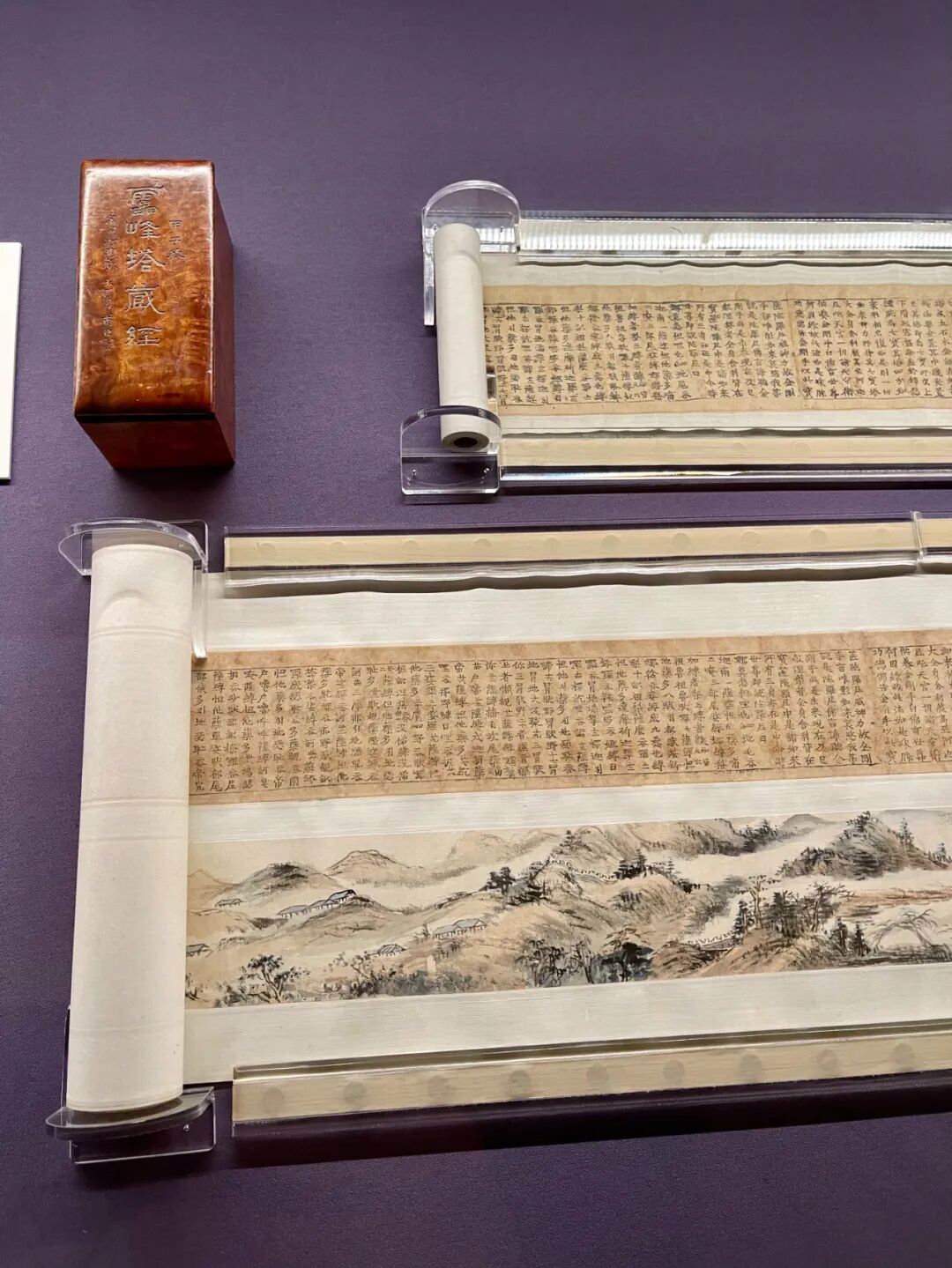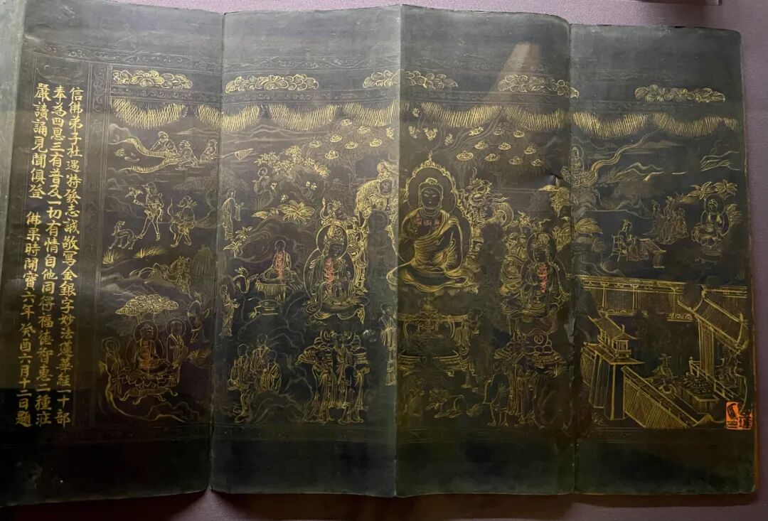走进“翰墨斑斓”板块,首先映入眼帘的是《妙法莲华经》,在展柜中闪动光泽。这是本次展览中年代最早的古籍,距今已有 1050 年。这本佛经由后秦鸠摩罗什翻译,于宋开宝六年(973 年)由一位名叫杜遇的信佛弟子写就。从写本的题记中可以得知,杜遇为表明自己的至诚心意,在价格高昂的瓷青纸上,用金粉书画标题、品名、佛像以及经文中的单字“佛”,用银粉书写其余部分,毕恭毕敬地抄写成共十部经书。但令人惋惜的是,目前存世的仅有三件。
