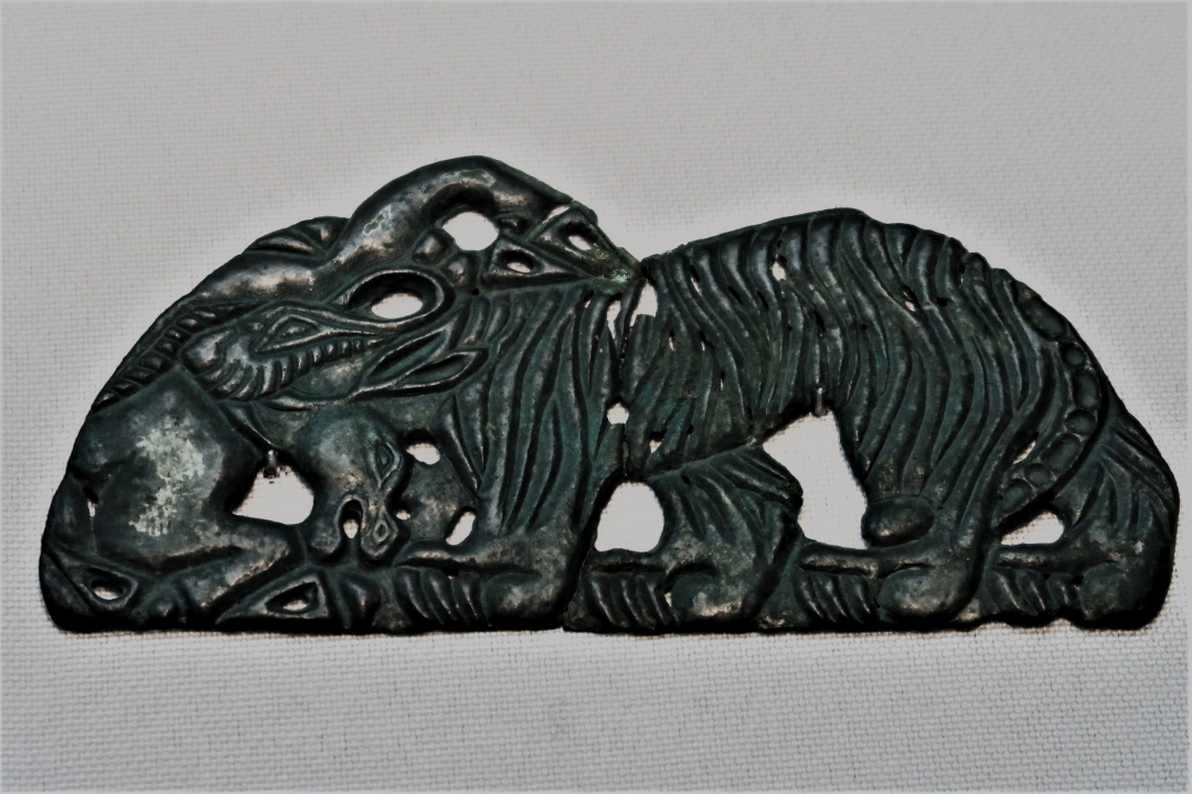 老虎与其他野兽咬斗的造型在鄂尔多斯装饰艺术中的表现十分丰富,除虎豕咬斗的塑造外还有虎咬鹿、虎咬驴、虎咬牛、虎咬马等。