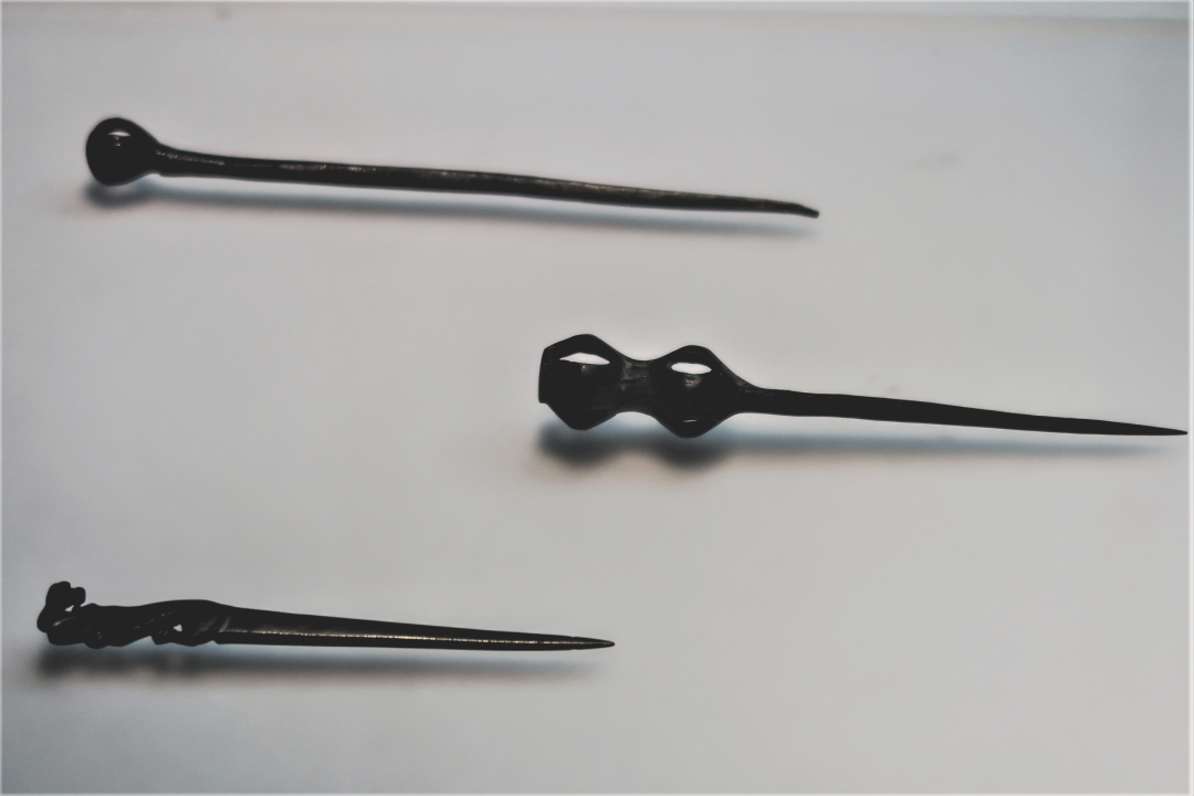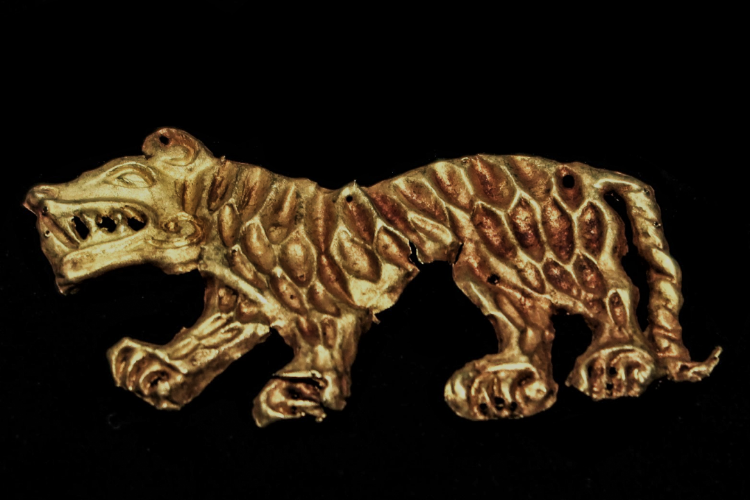 许多金片会被锤揲成小巧精致的老虎造型,上图展示的便是虎形金饰片和金饰牌,该造型的老虎四肢直立,双目前视,尾部自然下垂,艺术表现生动形象。虎的形象也会出现在别的小器物中,比如青铜挂钩中的虎,青铜虎和金饰虎的表现手法有所不同,青铜雕刻比之金饰要立体很多。