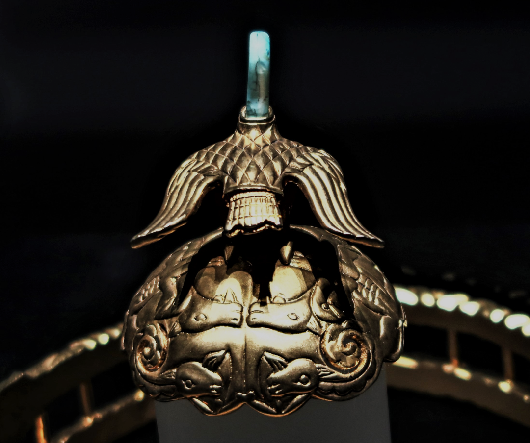金冠冠顶为镌刻细致的鹰形金质造物,鹰的头部饰以绿松石,黄金与宝石结合,使得该冠更显尊贵。鹰脚下半圆球体上刻有浮雕,为狼咬噬盘角羊之图案,前后榫卯相接形成圆形。