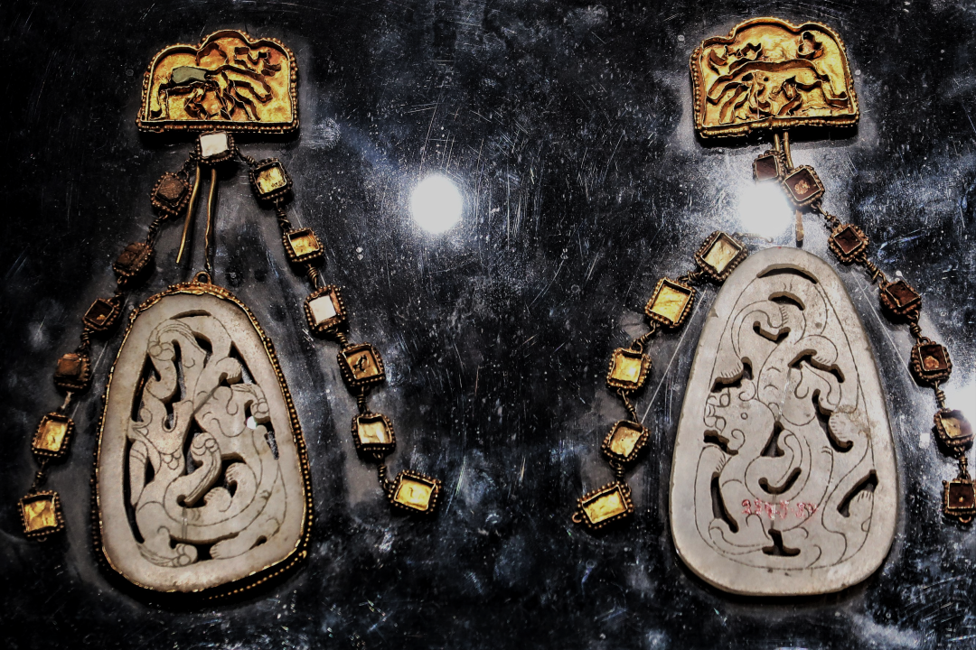 冠带同样有虎、马、羊的浮雕图案。动物纹饰为鄂尔多斯装饰艺术的突出特点,该冠冠顶的鹰造型为圆雕塑成,其余动物造型为浮雕技法,刻画写实细腻,各具特点,展现着鄂尔多斯艺术的独特魅力。墓葬中还出土了金银项链、金耳饰等,金银饰品非常丰富。