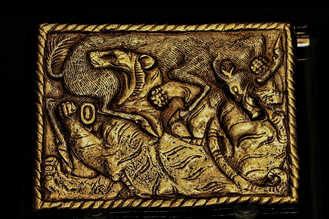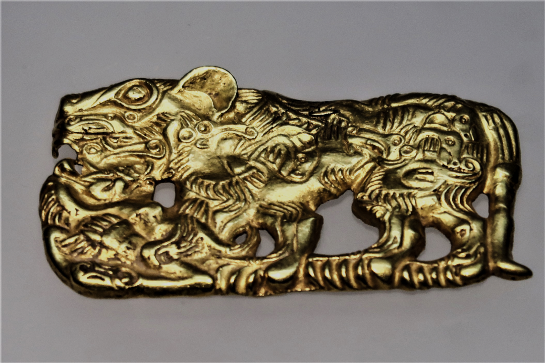 动物装饰题材是鄂尔多斯青铜器的最大特征。除开阿鲁柴登墓葬的鹰顶金冠,同样造型生动的是出土于准格尔旗西沟畔墓地虎豕咬斗纹金饰牌,该饰牌主体的图案为猛虎与野猪缠绕咬斗的造型,其浮雕效果强烈,猛虎在下,野猪在上,二者厮杀激烈,富有原始的艺术张力。