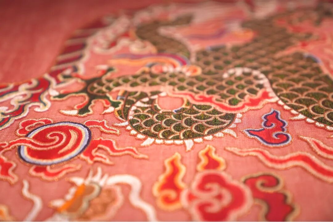织绣 抽纱 孔雀羽织金装花纱龙袍面料