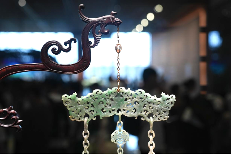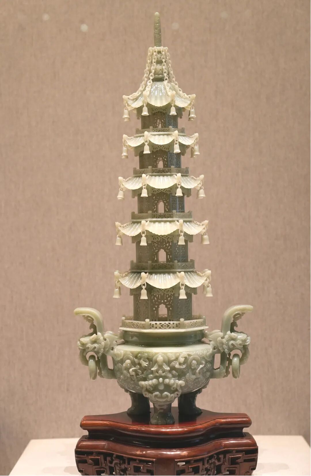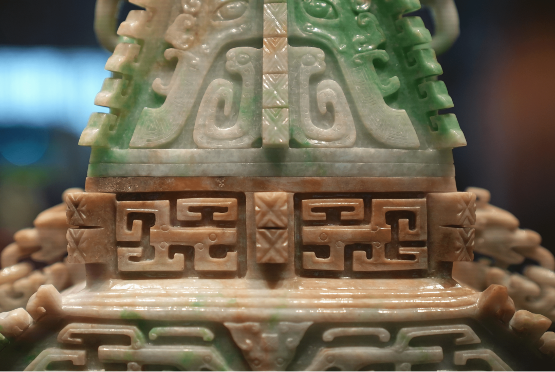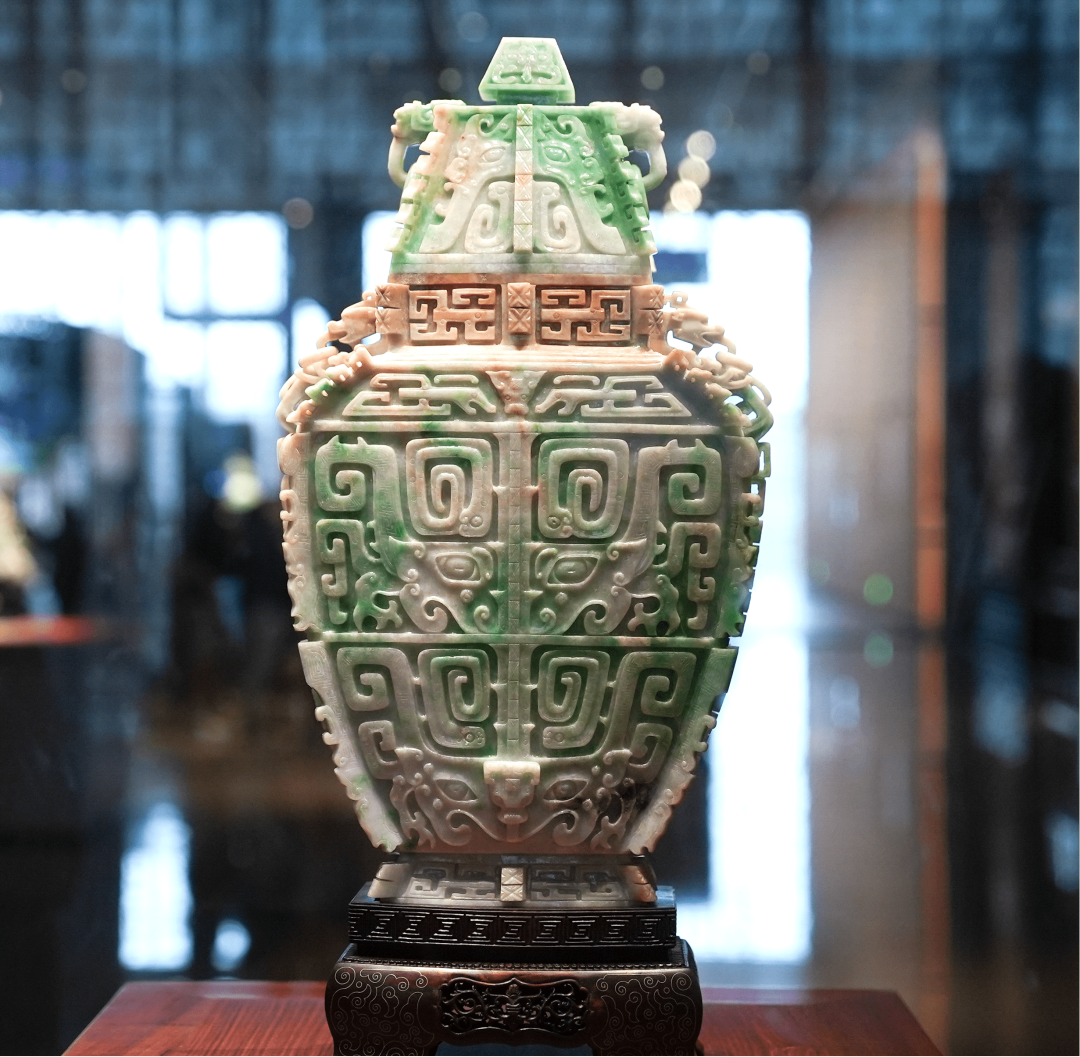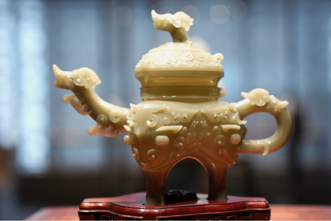 盉(hé),古人调和酒水的器具。展厅展出的玉雕作品“青玉兽面壶”,仿制的正是西周时期青铜盉的样式,其主体的兽面纹饰,为肃穆的作品增添了一分灵动活泼。
