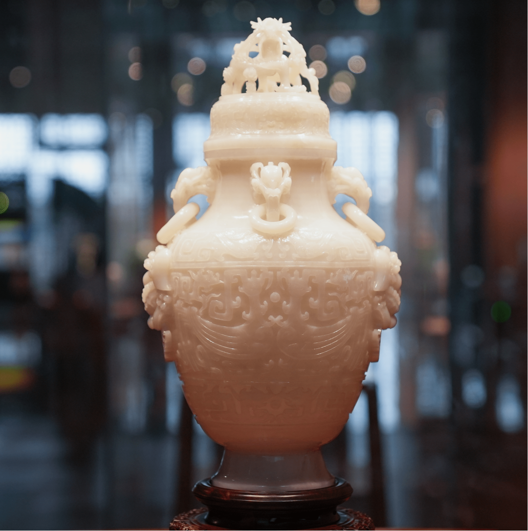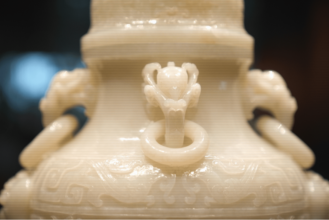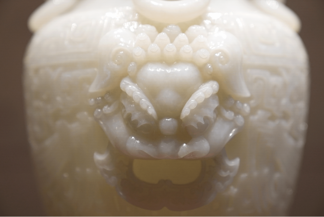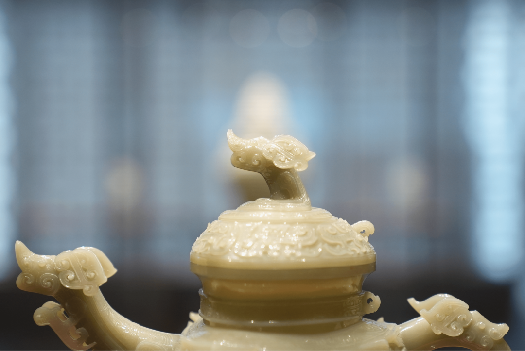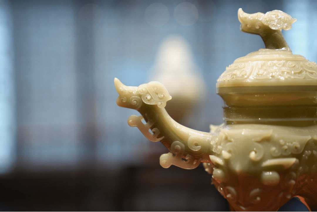 玉雕是中国最古老的雕刻品种之一。商周时期制玉成为一种专业,玉器成了礼仪用具和装饰配件。玉雕工艺十分繁杂,包括选料、设计、粗雕、细雕、修整和抛光等工序。展品中有几件青铜酒器的玉雕仿制品,工艺精美,给人温润恬淡之感,极具观赏价值。