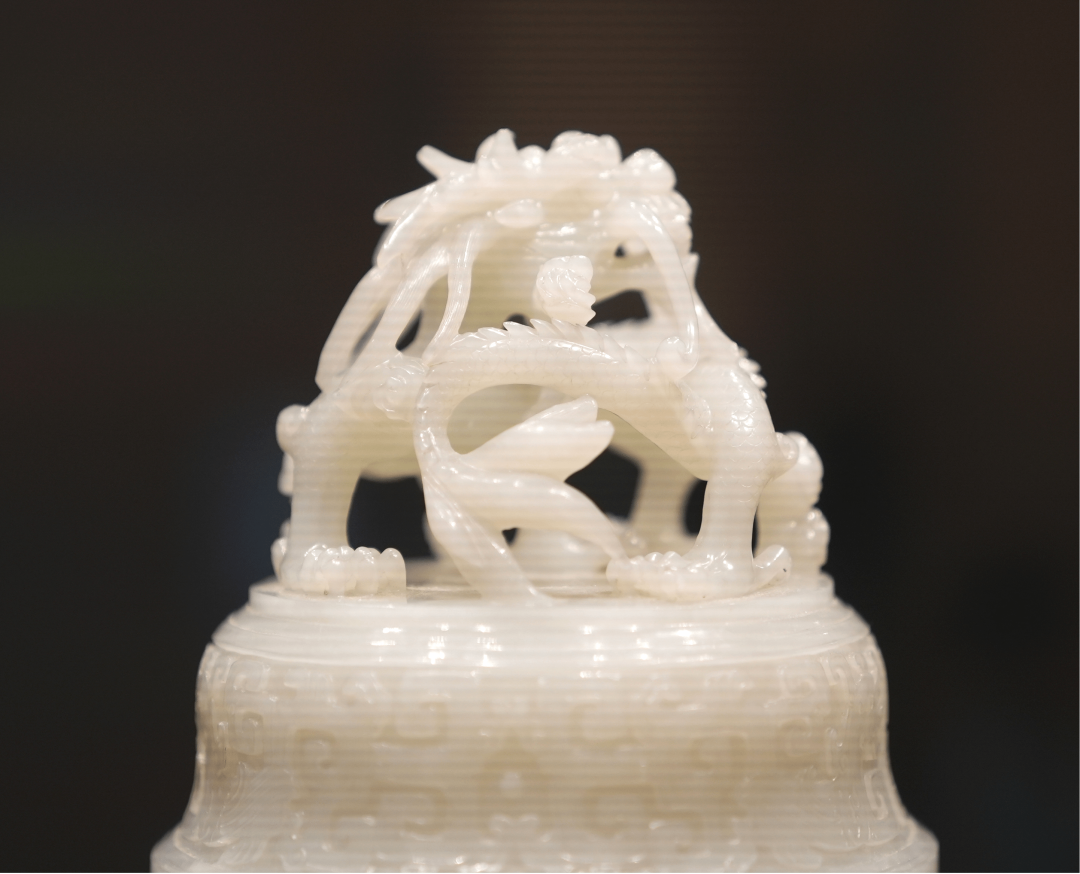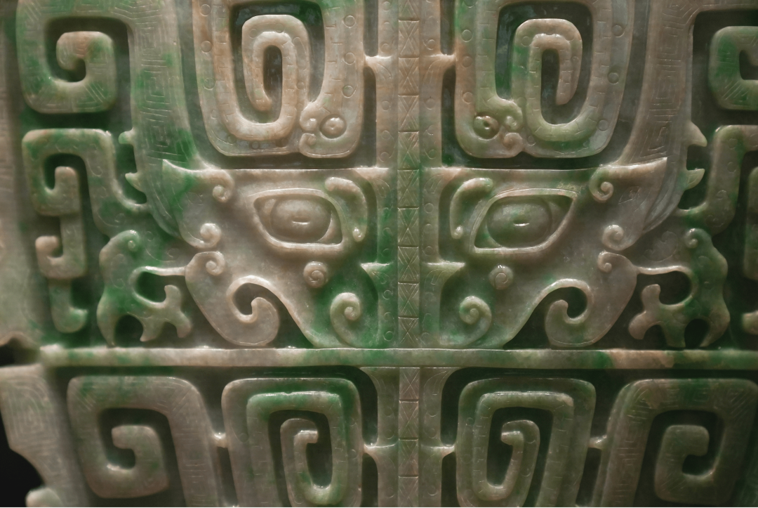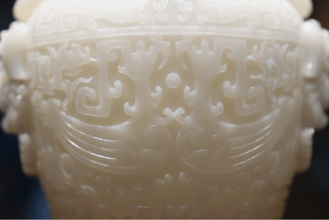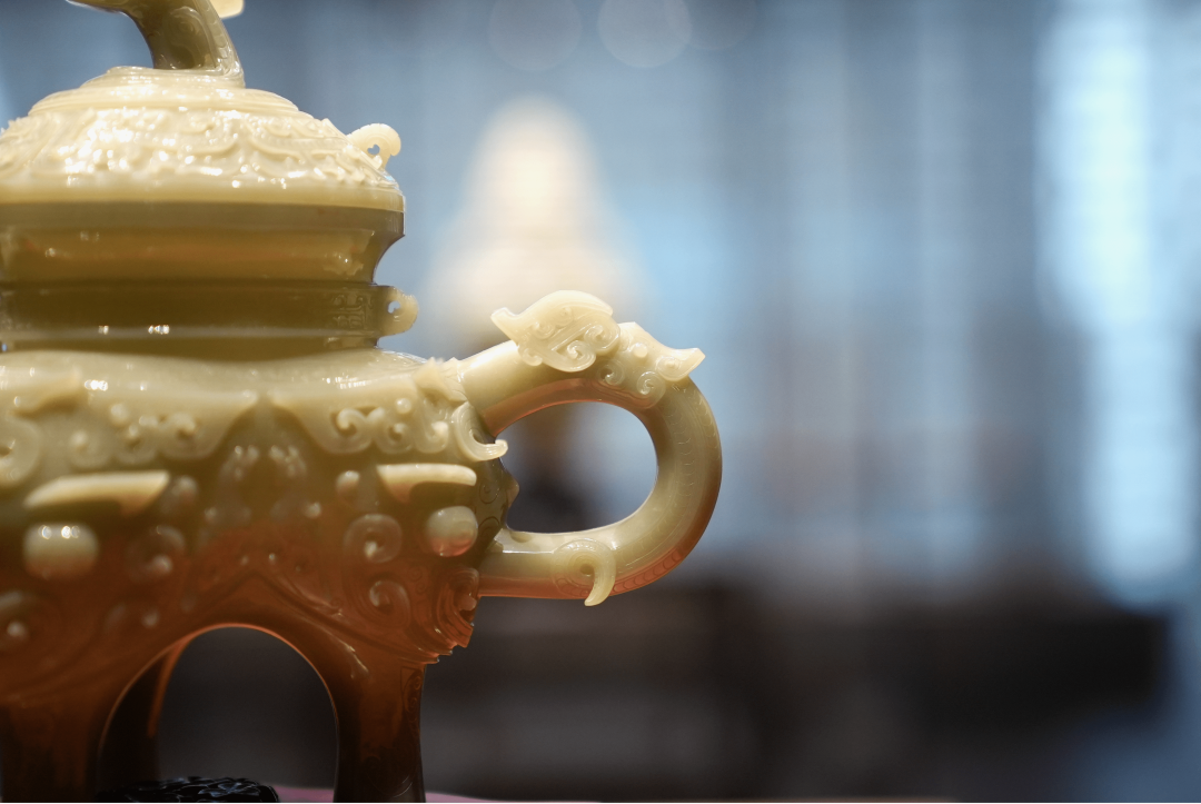 玉雕是中国最古老的雕刻品种之一。商周时期制玉成为一种专业,玉器成了礼仪用具和装饰配件。玉雕工艺十分繁杂,包括选料、设计、粗雕、细雕、修整和抛光等工序。展品中有几件青铜酒器的玉雕仿制品,工艺精美,给人温润恬淡之感,极具观赏价值。