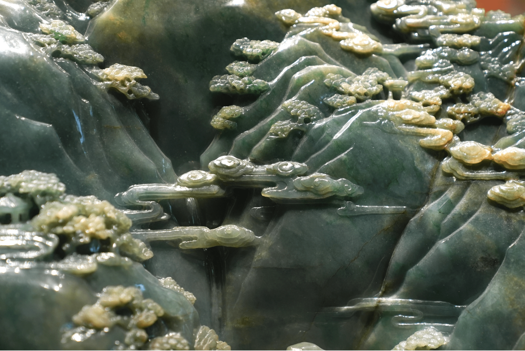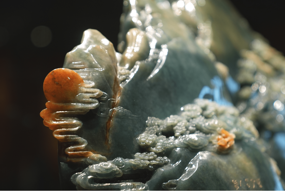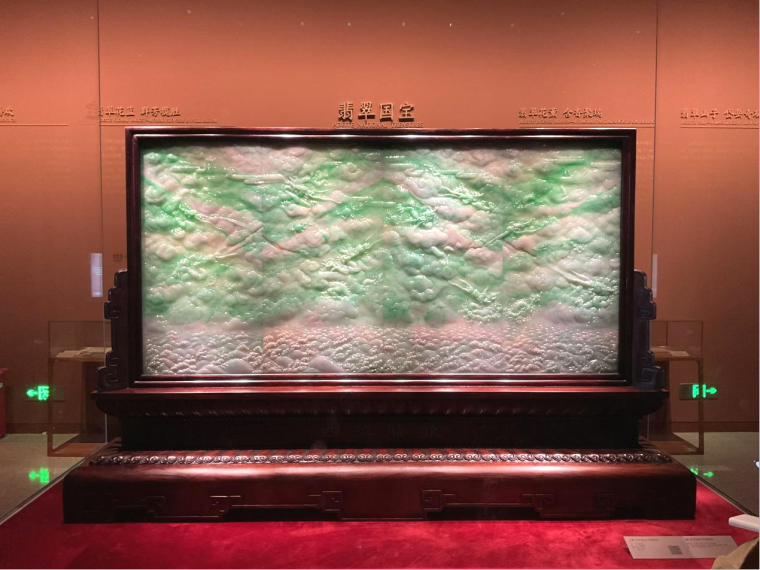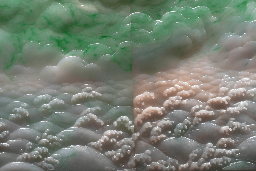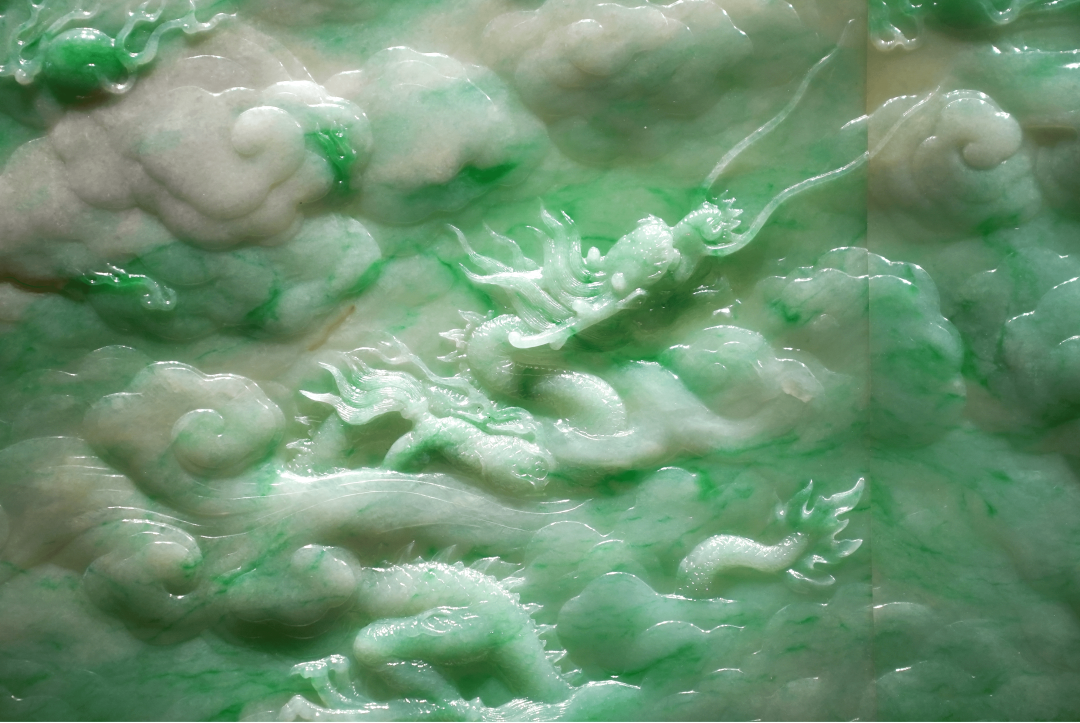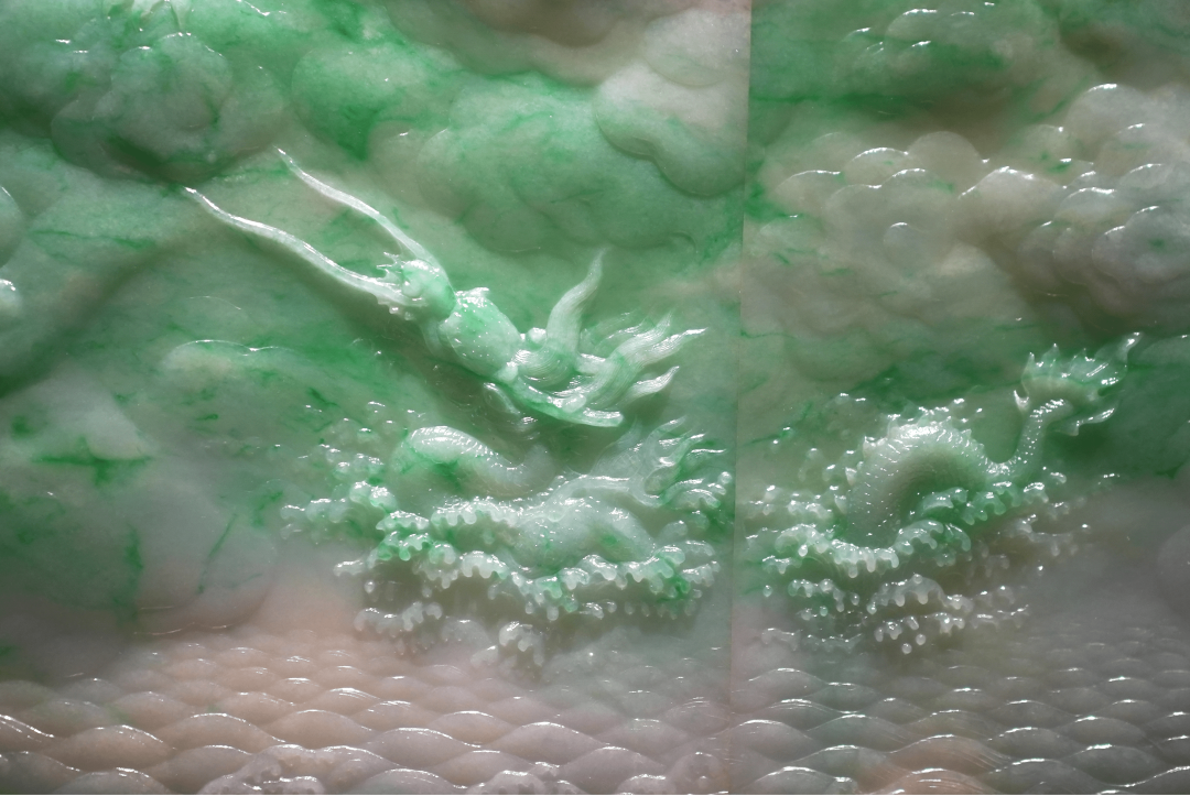 艺术家们因材施艺,充分利用原料的天然色泽,在绿色部位设计为龙,以深浮雕的技法精心雕琢,突出绿翠;在白、粉白、浅青色等部位则设计为云彩、水波纹,以浅浮雕的技法雕琢而成,以衬托龙的主题和绿翠。