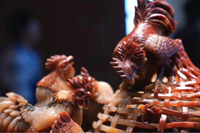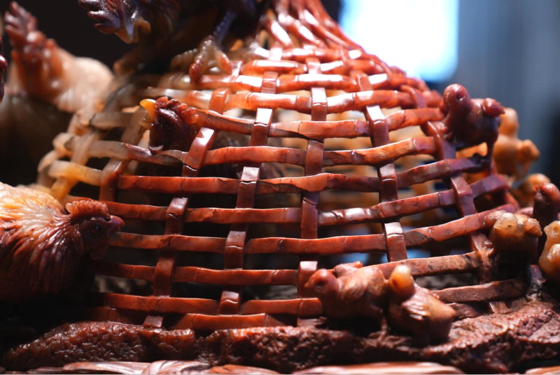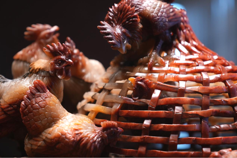 这件作品最大的难度在于隔着鸡笼对笼内的鸡身进行雕刻,即镂雕。镂雕对石料的要求比较高,尤其是镂空的部分,寿山石材质性要细、要纯,尽量少有裂纹和高密度的砂隔。镂雕讲究雕刻顺序,一般是“先外后内”,待外层景物、其他衬景等凿坯工序全部结束之后,再行镂空,以保证镂空出的石头不致崩裂。